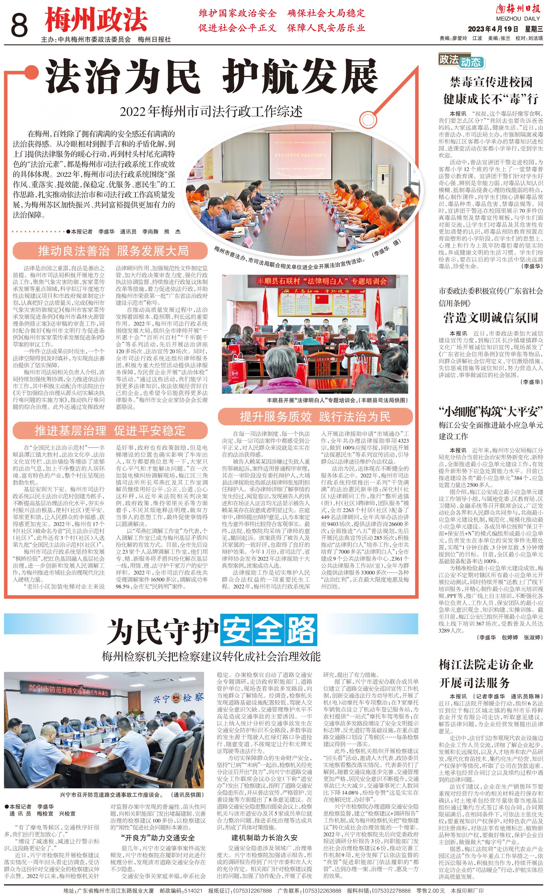 在梅州,百姓除了拥有满满的安全感还有满满的法治获得感。从冷眼相对到握手言和的矛盾化解,到上门提供法律服务的暖心行动,再到村头村尾充满特色的“法治元素”,都是梅州市司法行政系统工作成效的具体体现。2022年,梅州市司法行政系统围绕“强作风、重落实、提效能,保稳定、优服务、惠民生”的工作思路,扎实推动依法治市和司法行政工作高质量发展,为梅州苏区加快振兴、共同富裕提供更加有力的法治保障。
