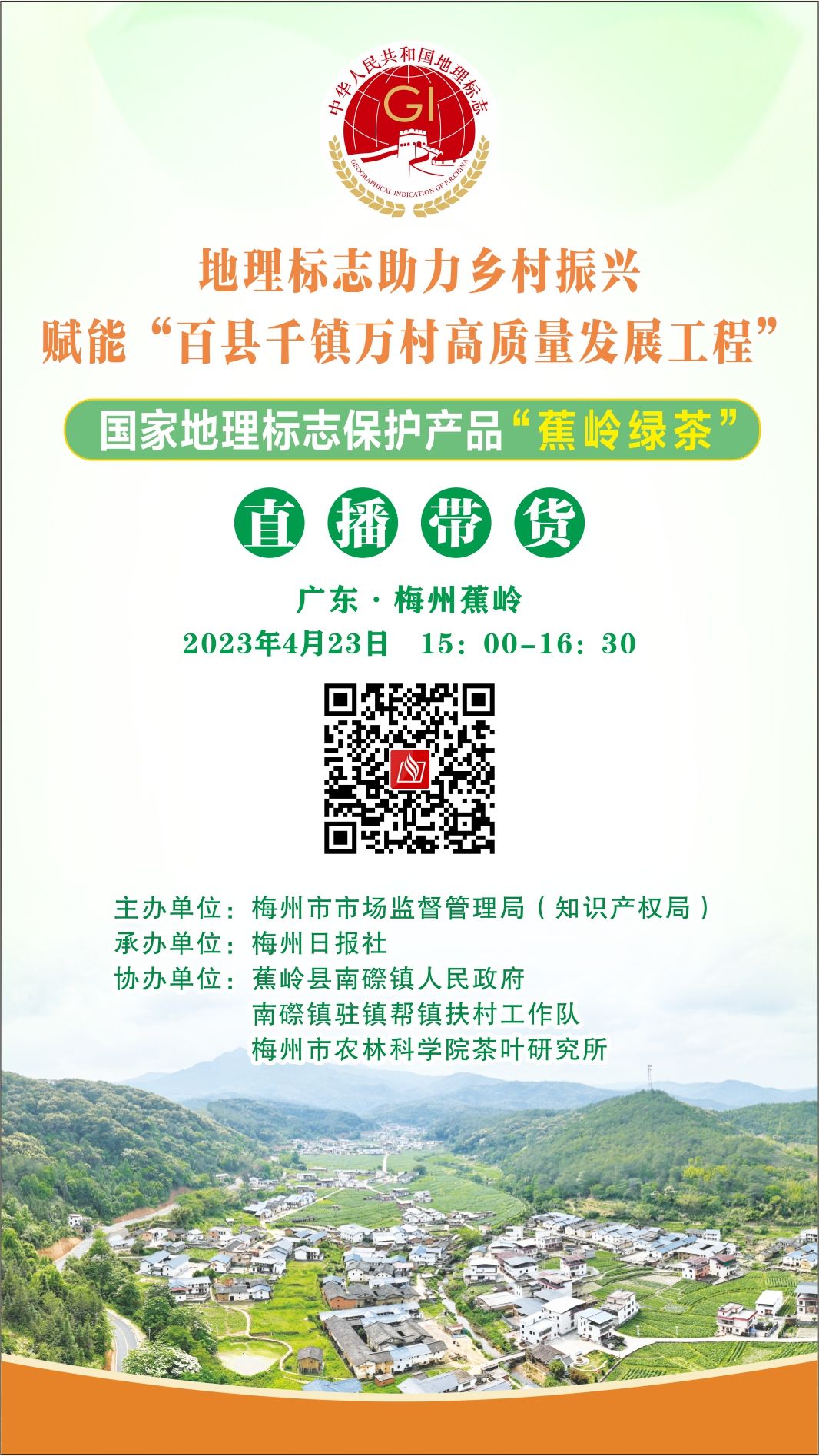 中华人民共和国地理标志是重要的知识产权类型,是促进区域特色经济发展的有效载体,是推进乡村振兴的有力支撑。为进一步落实地理标志运用促进工作,打响地区特色“金字招牌”,发挥地理标志品牌的引领、集聚、辐射效应,推动蕉岭绿茶产业高质量发展,促进蕉岭绿茶资源优势转化为商标品牌优势和市场竞争优势,推进我市乡村全面振兴,梅州市市场监督管理局(知识产权局)联合梅州日报社开展“地理标志助力乡村振兴——赋能百县千镇万村高质量发展工程” 直播带货活动。