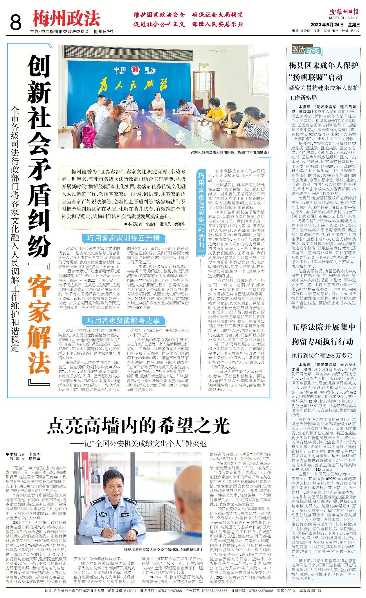 梅州被誉为“世界客都”,客家文化积淀深厚、多姿多彩。近年来,梅州市各级司法行政部门结合工作职能,积极开展新时代“枫桥经验”本土化实践,将客家优秀传统文化融入人民调解工作,巧用客家家训、歌谣、谚语等,用客家的语言为客家百姓说法解纷,创新社会矛盾纠纷“客家解法”,及时把矛盾纠纷化解在基层、化解在萌芽状态,有效维护全市社会和谐稳定,为梅州经济社会高质量发展奠定基础。