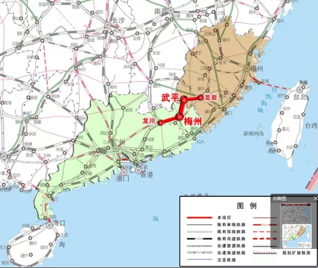 龙龙高铁武梅段项目位于福建省和广东省境内,线路自在建的龙龙高铁武平站引出,经龙岩市武平县,梅州市蕉岭县、梅县区、梅江区,引入梅州西站,与在建的梅州至龙川高铁衔接。新建正线全长约102公里,桥隧比约82.6%,按双线、时速250公里设计建设。根据计划安排,该项目力争2023年底具备开工条件,2028年建成通车。