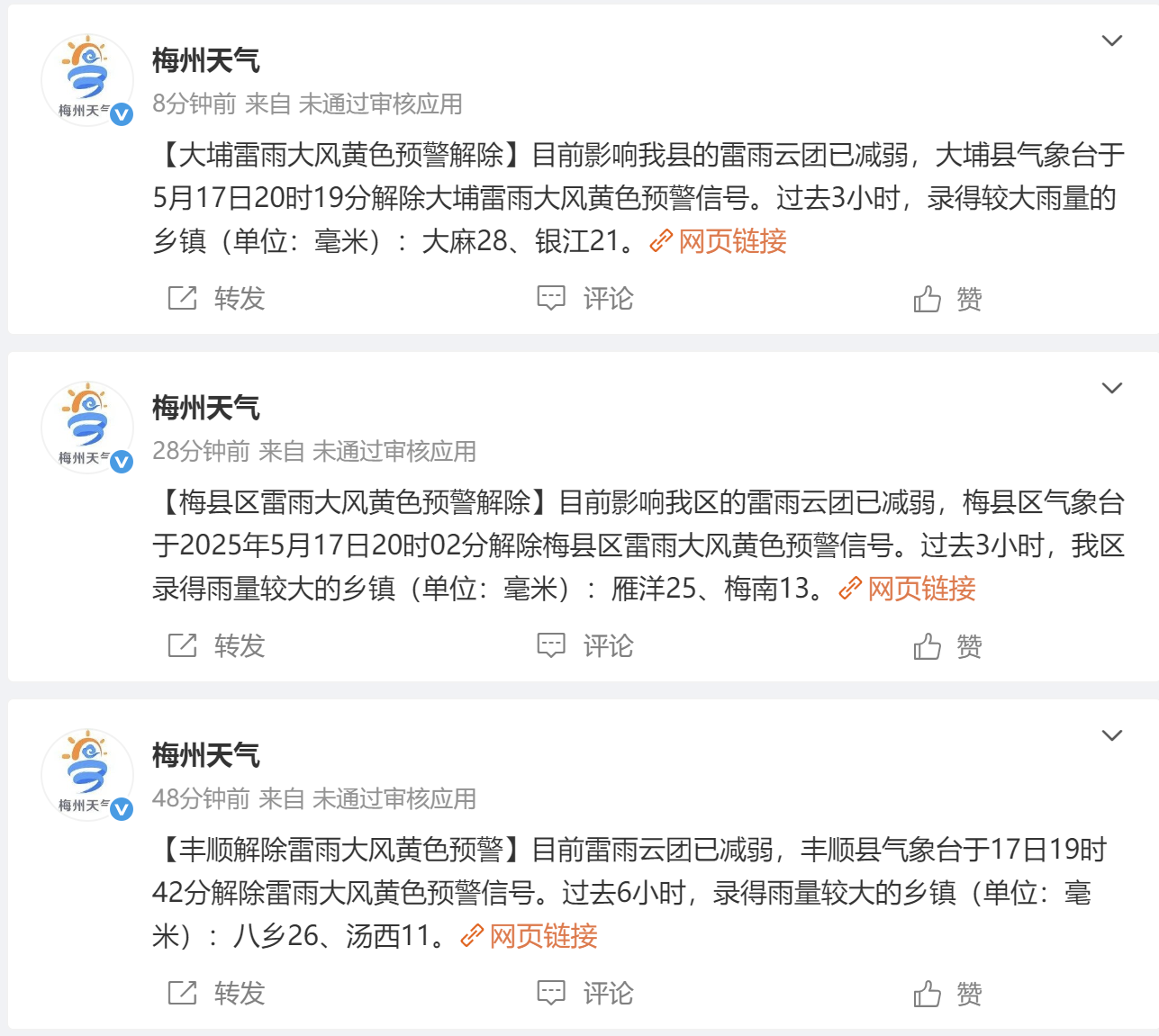大埔县、梅县区、丰顺县解除雷雨大风黄色预警。