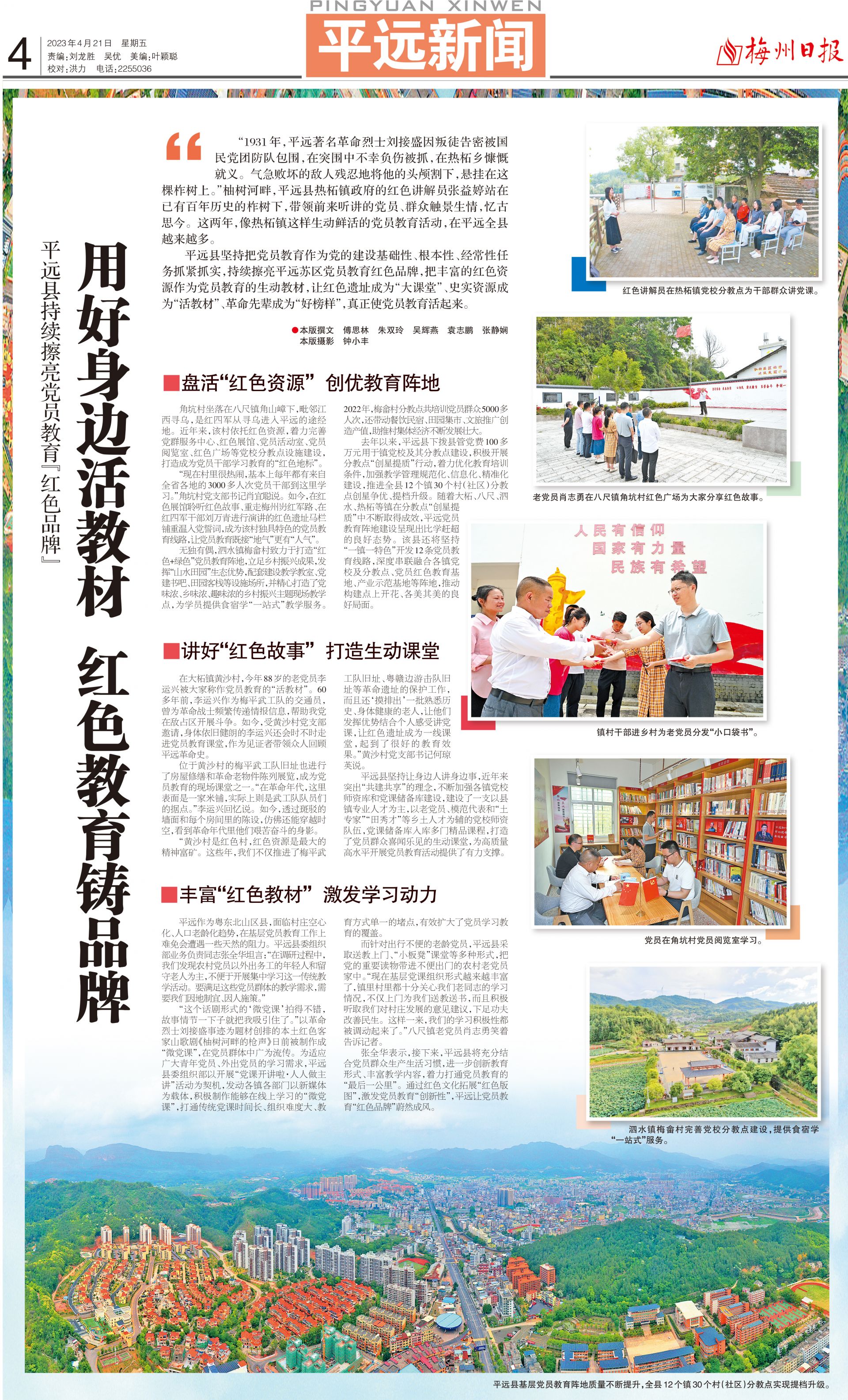 平远县坚持把党员教育作为党的建设基础性、根本性、经常性任务抓紧抓实,持续擦亮平远苏区党员教育红色品牌,把丰富的红色资源作为党员教育的生动教材,让红色遗址成为“大课堂”、史实资源成为“活教材”、革命先辈成为“好榜样”,真正使党员教育活起来。
