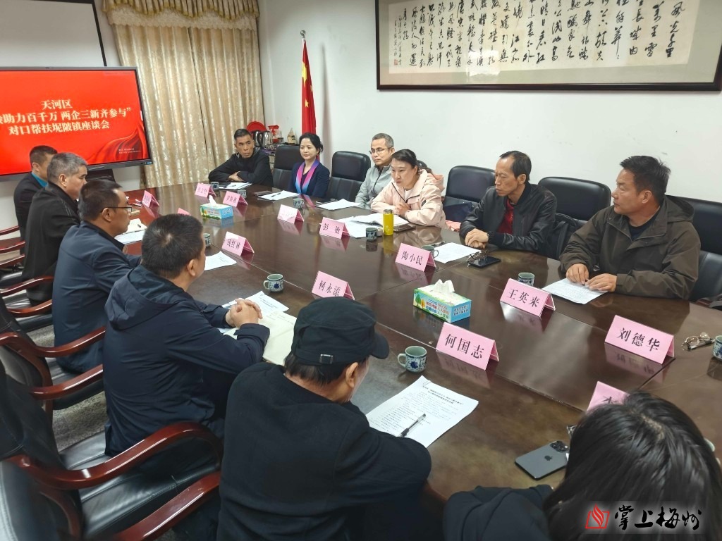 座谈会上,坭陂镇党委书记何永添介绍了坭陂镇的概况、“百千万工程”推进情况,并希望天河区在人才引进、高新技术、产业升级等方面予以支持。工作队队长朱乐生详细汇报了第二轮工作队进驻以来的工作情况。调研团队成员踊跃发言,老干部代表刘德华表示,将积极充当乡村振兴宣传员作用,同时利用老干部的经验为坭陂镇的发展献计献策。天河区委统战部副部长、工商联党组书记陶小民强调,“兴宁所需,天河所能”,天河区工商联下一步将推动天河企业家、商会来坭陂镇开展交流合作,深化协作关系。