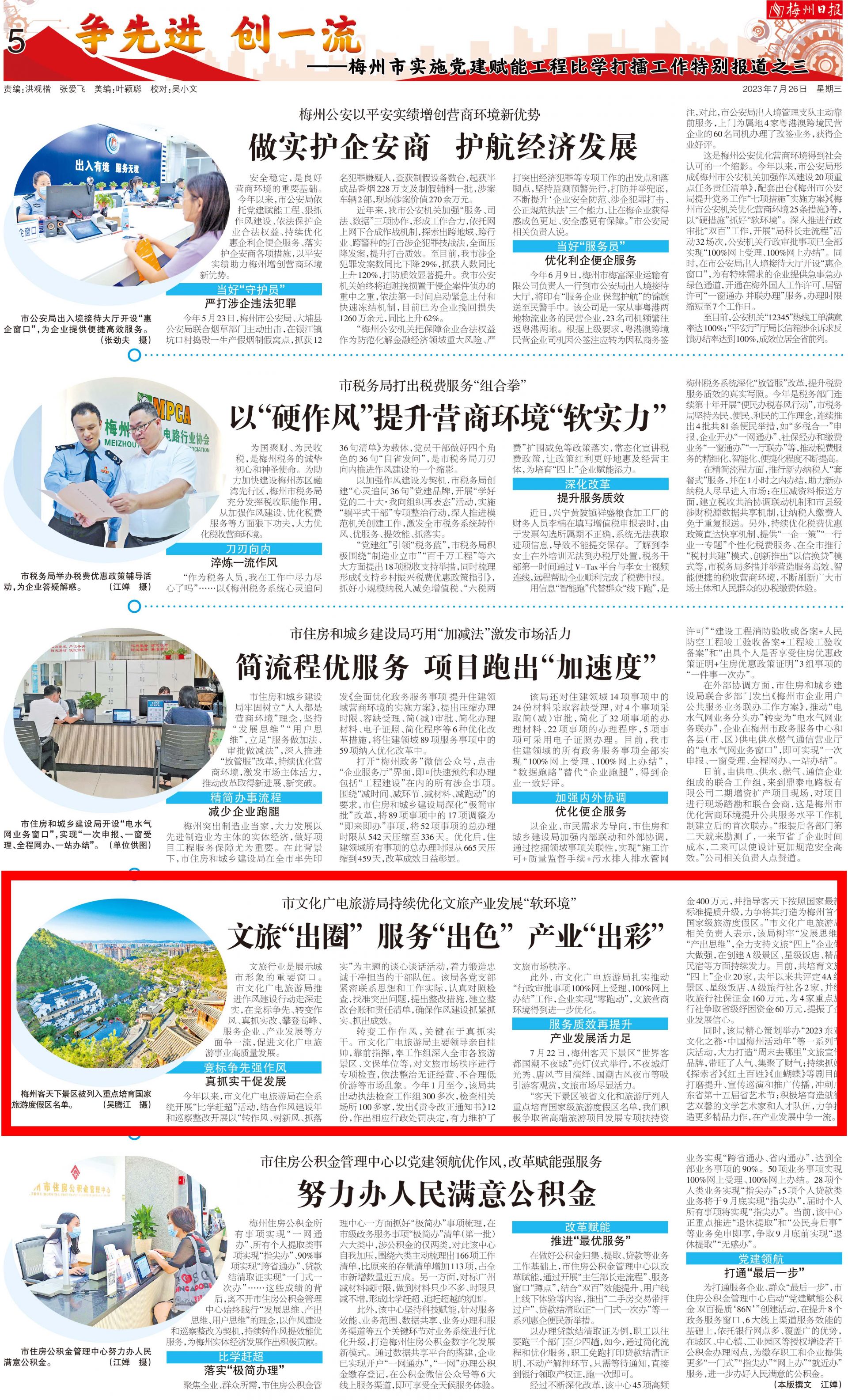 同时,该局精心策划举办“2023东亚文化之都·中国梅州活动年”等一系列节庆活动,大力打造“周末去哪里”文旅宣传品牌,带旺了人气、集聚了财气;持续抓好《探索者》《红土百姓》《血蝴蝶》等剧目的打磨提升、宣传巡演和推广传播,冲刺广东省第十五届省艺术节;积极培育造就德艺双馨的文学艺术家和人才队伍,力争打造更多精品力作,在产业发展中争一流。