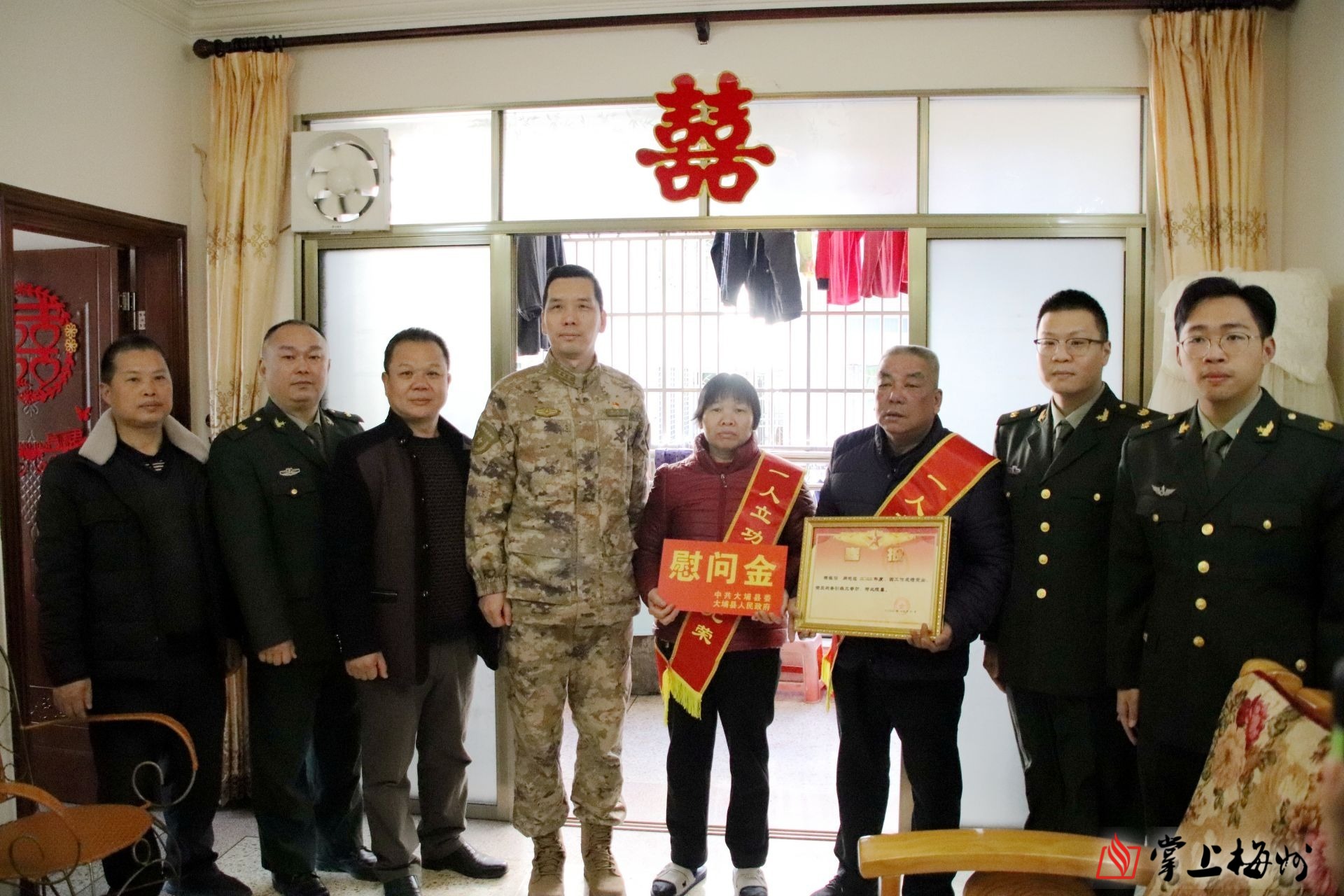 掌上梅州讯 1月31日上午,大埔县人武部联合县退役军人事务局前往百侯镇,为荣立三等功的现役军人杨振滔家属送上三等功喜报和慰问品。