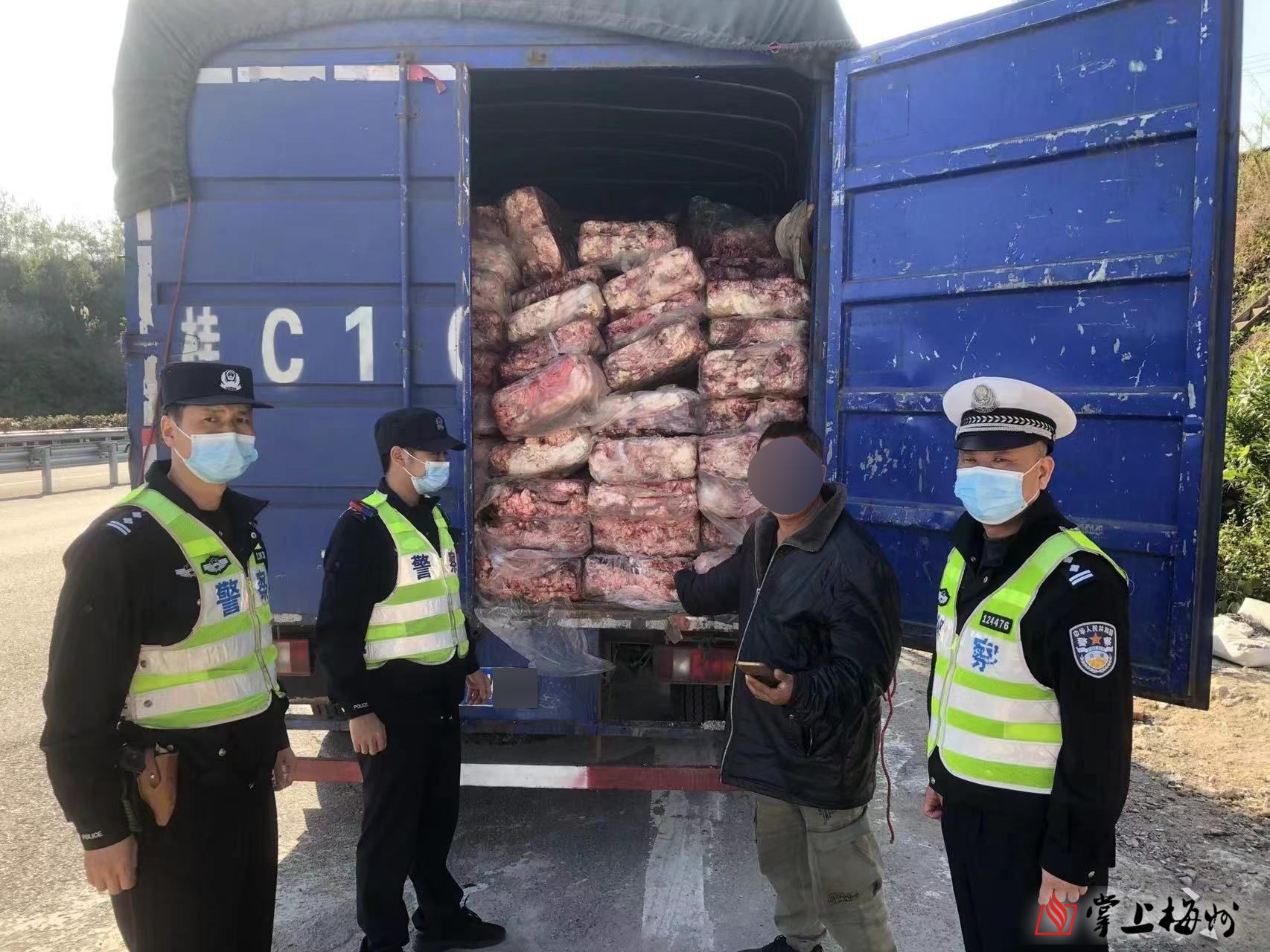 2月16日15时许,大埔西河省际公安检查站执勤民警在入省方向依法对一辆悬挂桂C1***1号牌的货车进行检查时,现场查获无任何检验检疫手续的猪肉、猪油产品约9吨,驾驶员龙某无法提供运输该产品相关合格材料,已移交大埔县市场监督局调查处理。