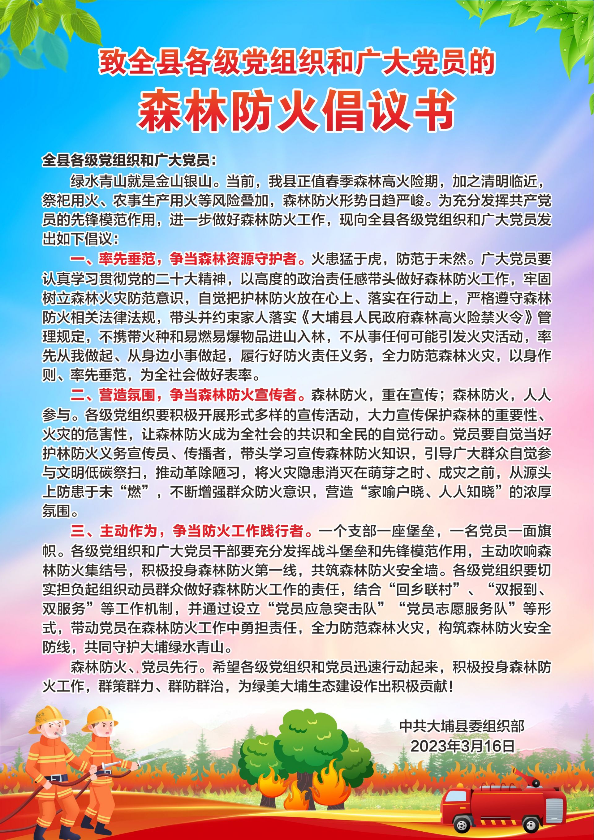 绿水青山就是金山银山。当前,我县正值春季森林高火险期,加之清明临近,祭祀用火、农事生产用火等风险叠加,森林防火形势日趋严峻。为充分发挥共产党员的先锋模范作用,进一步做好森林防火工作,现向全县各级党组织和广大党员发出如下倡议: