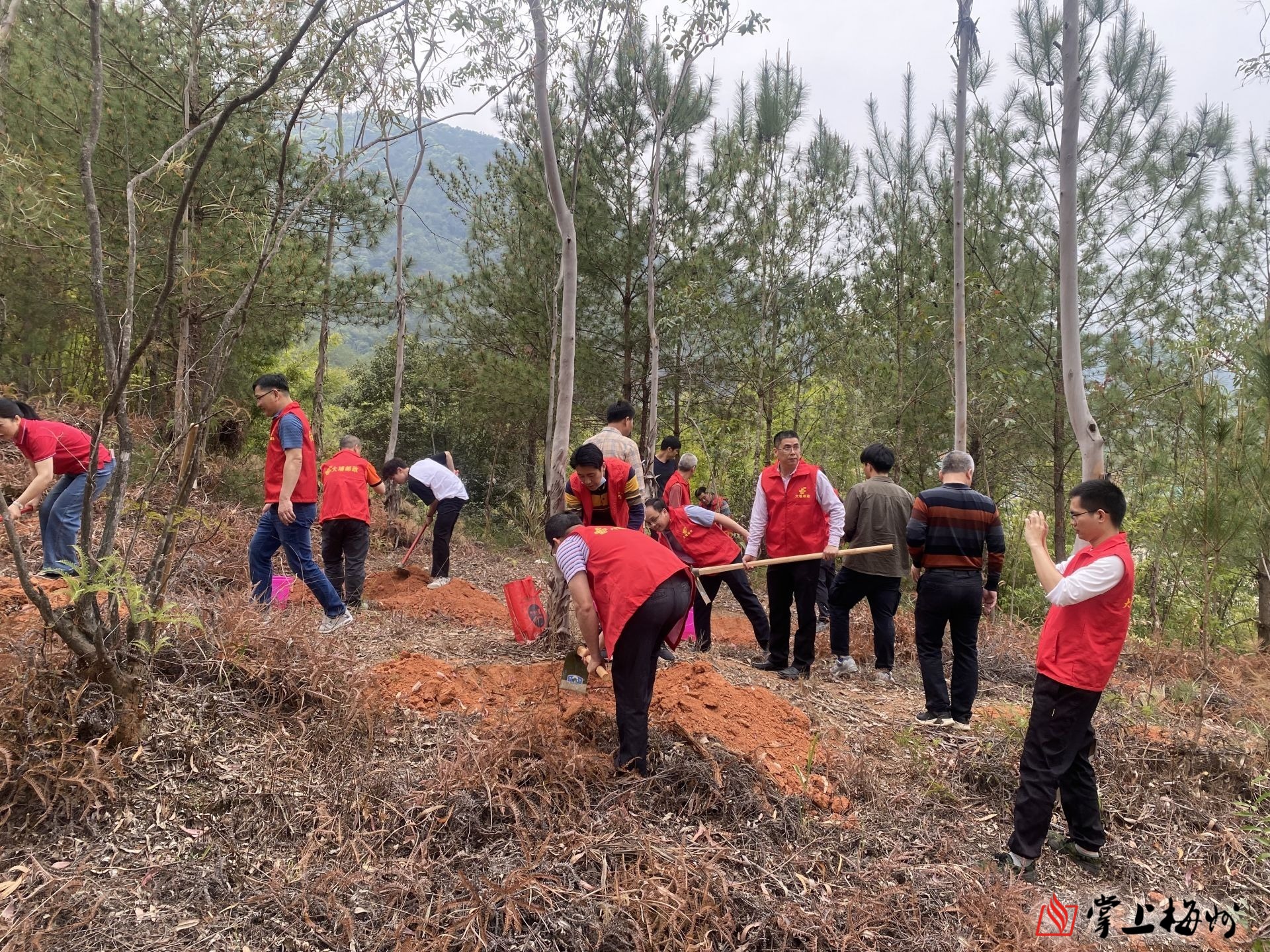 在绿美广东示范点,大埔县林业局、县邮政储蓄银行大埔支行相关人员共同开展植树活动。大家分工协作,配合默契,搬运树苗、挥锹铲土、培土浇水,种下红锥、枫香等500多株树种。