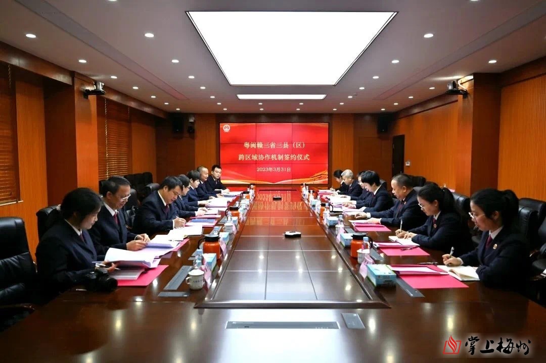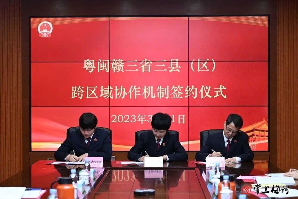 掌上梅州讯 3月31日上午,大埔县人民检察院与福建省龙岩市永定区人民检察院、江西省赣州市寻乌县人民检察院联合签订《关于建立跨区域协作机制的实施意见》(下称《意见》)。永定区检察院党组书记、检察长刘兴焕,寻乌县检察院党组书记、检察长王泉花,大埔县人民检察院党组书记、检察长王青以及三院相关人员参加会议。