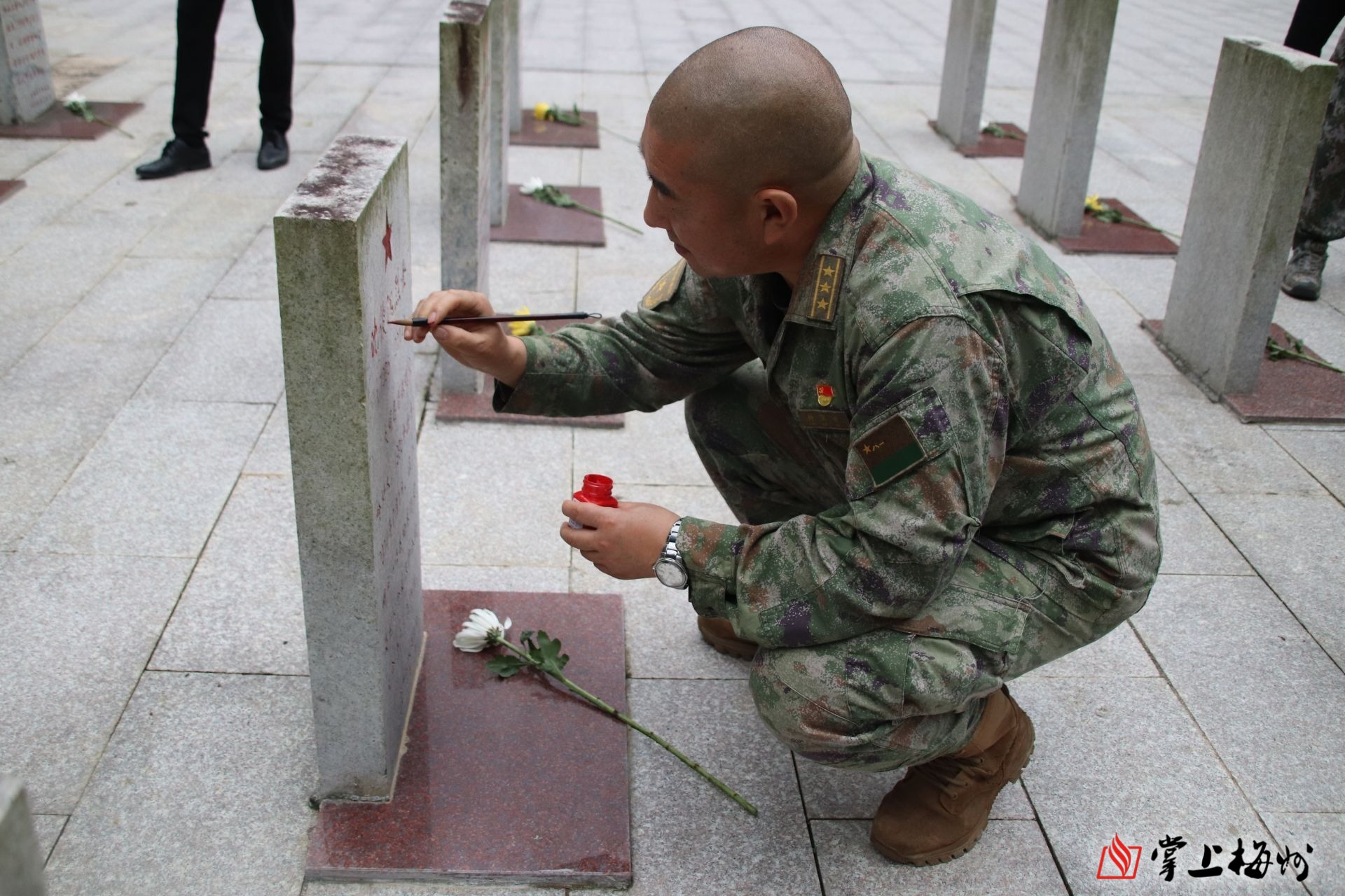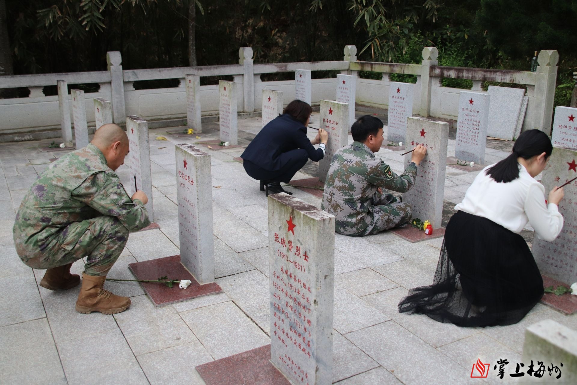 向烈士三鞠躬后,全体人员擦拭墓碑,清理周边环境卫生,最后取出红漆和毛笔,一笔一画地将墓碑上铭文描红填墨。