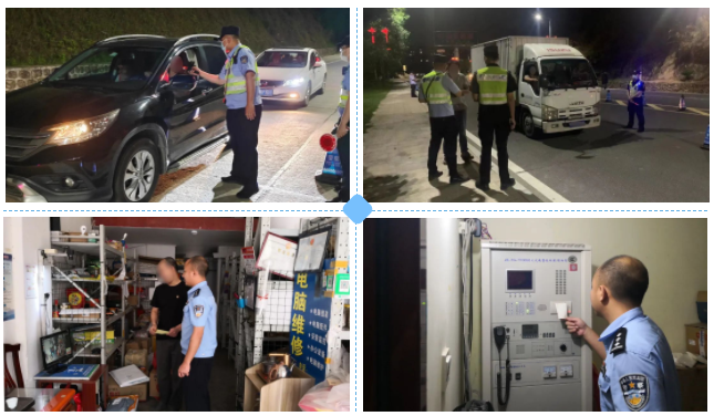 据统计,行动期间,全县公安机关共出动警辅力量139人(次),破获刑事案件4宗,治安案件1宗,共抓获违法犯罪嫌疑人15名(其中涉诈1名、涉黄4名、涉盗窃4名、涉寻衅滋事、聚众斗殴、故意伤害等违法犯罪嫌疑人6名);清查各类场所46间,检查涉枪爆、管制刀具从业单位3间;发现整改问题隐患2处,排查道路安全隐患4处、排查车辆安全隐患4处,路(街)面设卡7个,检查车辆261辆、盘查人员296人,查处交通违法行为17起。