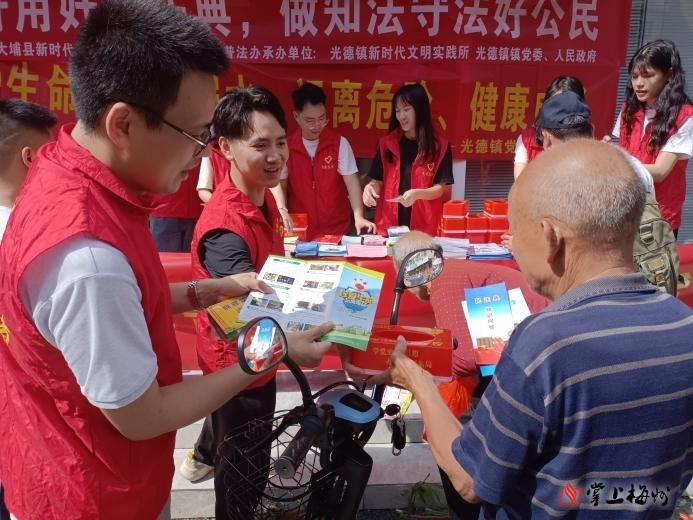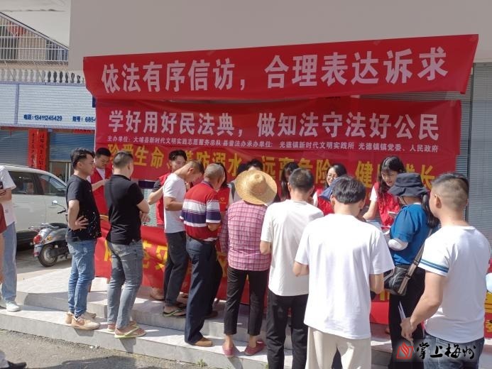 5月17日,大埔县光德镇综治中心联合光德司法所、光德镇新时代文明实践所、应急办、教育、食安办等部门在光德镇富新街开展普法主题宣传活动。