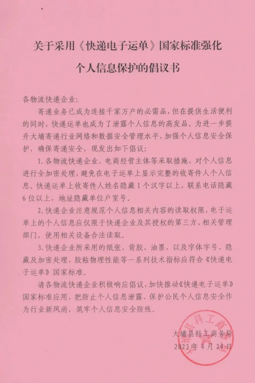 针对发现的问题,大埔县检察院积极与相关行政机关座谈磋商,就如何督促快递行业采取有效手段保护用户个人信息进行了深入探讨。磋商后,行政机关向全县各物流快递企业发放《关于采用<快递电子运单>国家标准强化个人信息保护的倡议书》和《快递电子运单》宣传单等,督促快递企业加强运营管理、提升服务质量,为快递运单上的个人信息穿上“隐身衣”。