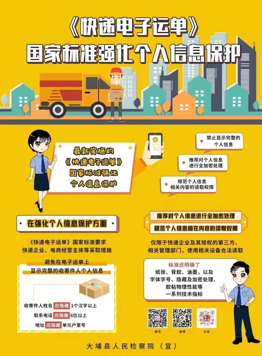 为深入落实最高检“七号检察建议”,加强个人信息安全保护,推动快递行业健康持续发展,近期,大埔县检察院依法对大埔县辖区内快递行业公民个人信息保护情况开展了专项监督活动。在调查了解全县14个乡镇的快递经营服务点的状况后,发现部分快递运单不符合《快递电子运单》(GB/T 41833-2022)中关于“禁止显示完整的个人信息”之规定,存在“收寄件姓名未隐藏1个汉字以上、联系电话未隐藏6位以上、地址未隐藏单元户室号”等问题。