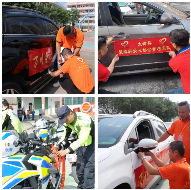 此次活动中,万川爱心协会和聚缘轩爱心协会共组建了34辆护考应急车队,为有需要的考生提供应急接送服务,同时在虎山中学和田家炳实验中学两个高考考点设置临时志愿服务岗亭,组织志愿者为考生提供应急诊疗、备用文具、雨伞、矿泉水等应急服务。