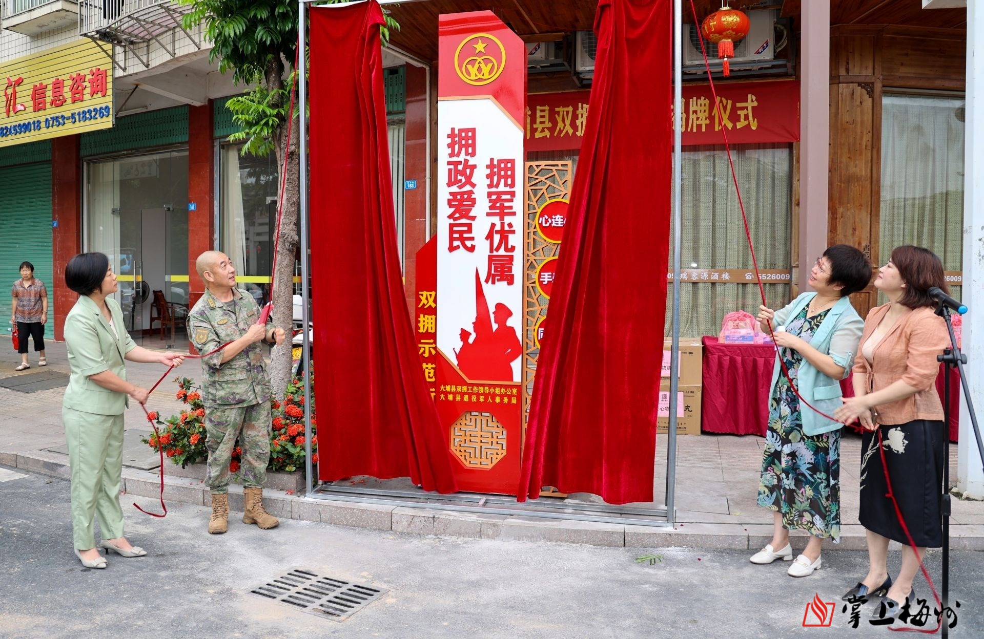 掌上梅州讯 6月16日上午,大埔县“双拥示范街”揭牌仪式在大埔县湖寮镇内环西路与大兴路交汇处举行,揭牌仪式由县政府副县长饶凌云同志主持,县委常委、县人武部政委杨润世、县府办副主任张海琳、县退役军人事务局局长邓秀丽、县退役军人事务局分管领导、全局干部职工,湖寮镇分管负责同志以及部分拥军门店代表、全县退役军人代表等约45人出席仪式。