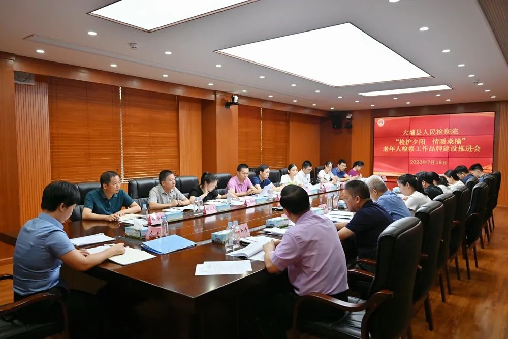 为进一步深化老年人检察工作品牌建设,7月18日下午,大埔县检察院召开“检护夕阳 情暖桑榆”老年人检察工作品牌建设推进会,对品牌建设工作再部署、再谋划、再推进。会议由该院党组书记、检察长王青主持,党组成员、各部室负责人和副主任及员额检察官参加。