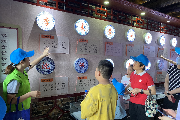 图为游客参观大埔县客家家风家训馆百家姓氏展室。
