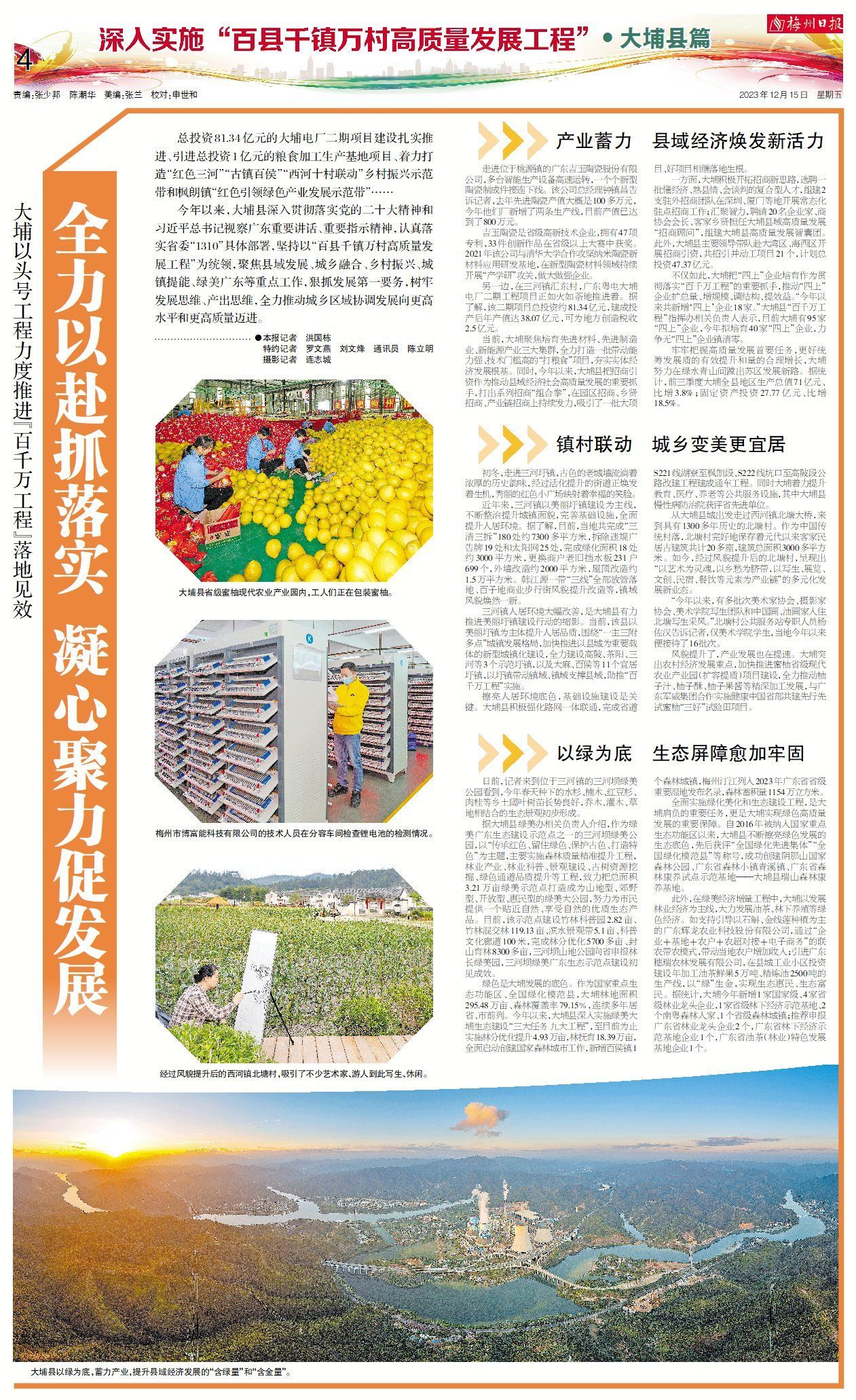 今年以来,大埔县深入贯彻落实党的二十大精神和习近平总书记视察广东重要讲话、重要指示精神,认真落实省委“1310”具体部署,坚持以“百县千镇万村高质量发展工程”为统领,聚焦县域发展、城乡融合、乡村振兴、城镇提能、绿美广东等重点工作,狠抓发展第一要务,树牢发展思维、产出思维,全力推动城乡区域协调发展向更高水平和更高质量迈进。