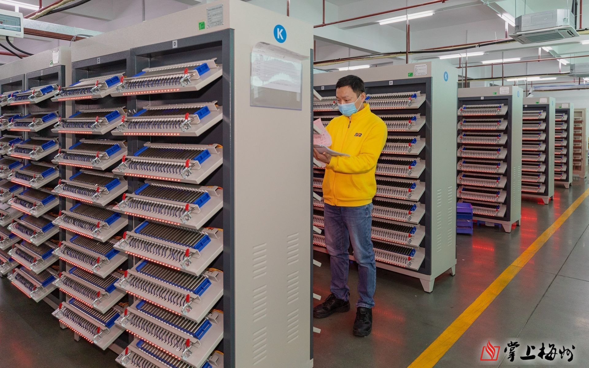 梅州市博富能科技有限公司的技术人员在分容车间检查锂电池的检测情况。