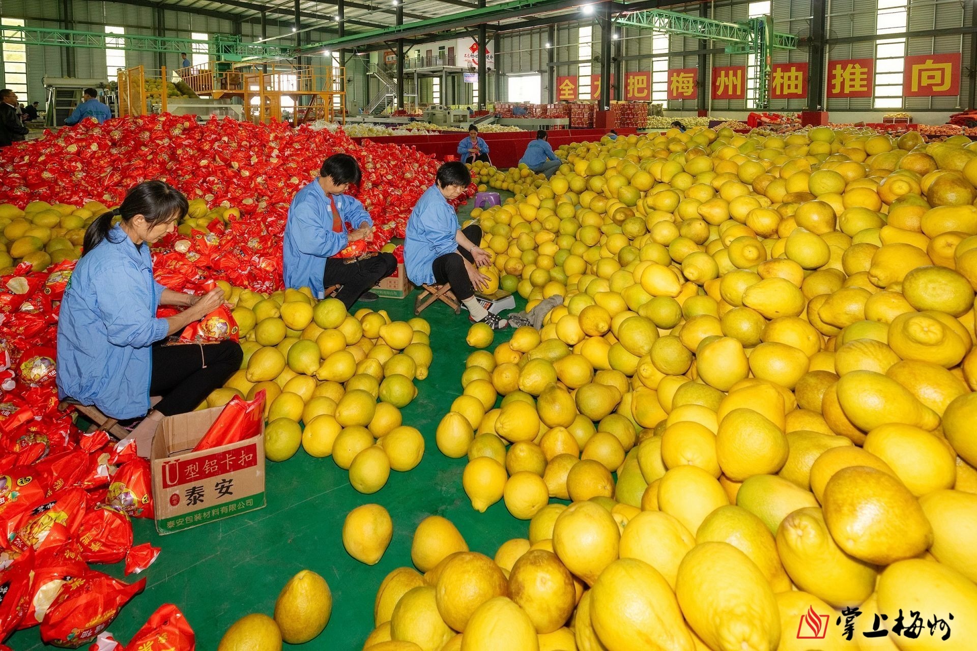 大埔县省级蜜柚现代农业产业园内,工人们正在包装蜜柚。