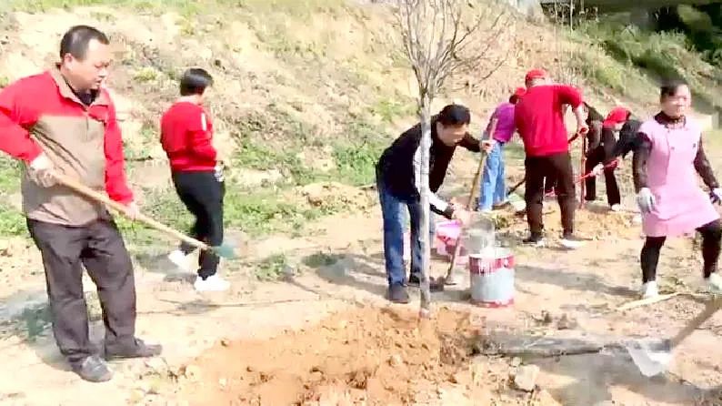 干部职工在植树现场,热情高涨,有的挥锹铲土、有的扶树填土、踩实压紧、浇水灌根,大家相互配合,分工有序,干劲十足。一棵棵新栽下的树苗昂然挺立,静待新芽吐绿,为春日里的大埔增添了一抹盎然生机。