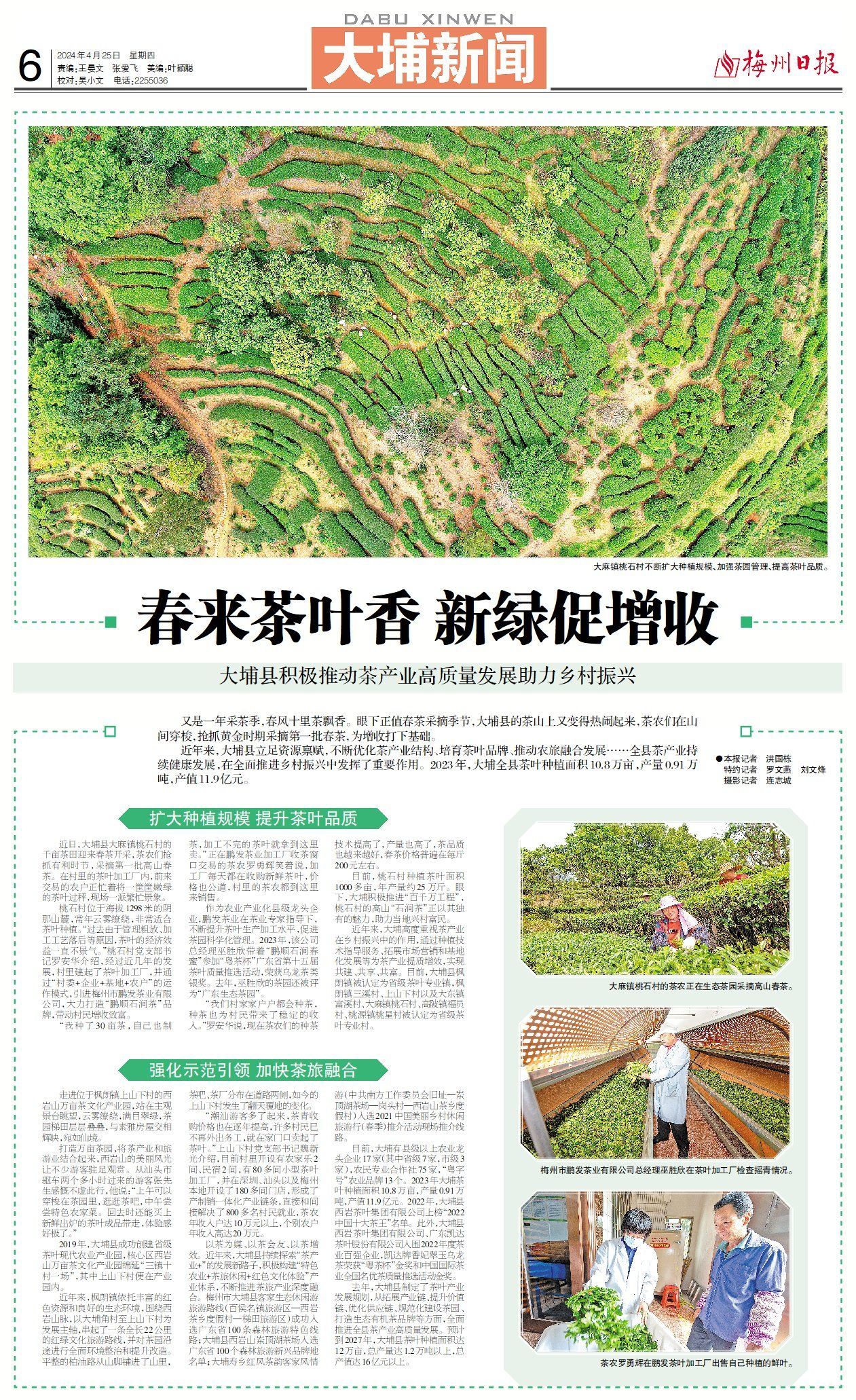 近年来,大埔高度重视茶产业在乡村振兴中的作用,通过种植技术指导服务、拓展市场营销和基地化发展等为茶产业提质增效,实现共建、共享、共富。目前,大埔县枫朗镇被认定为省级茶叶专业镇,枫朗镇三溪村、上山下村以及大东镇富溪村、大麻镇桃石村、高陂镇福员村、桃源镇桃星村被认定为省级茶叶专业村。