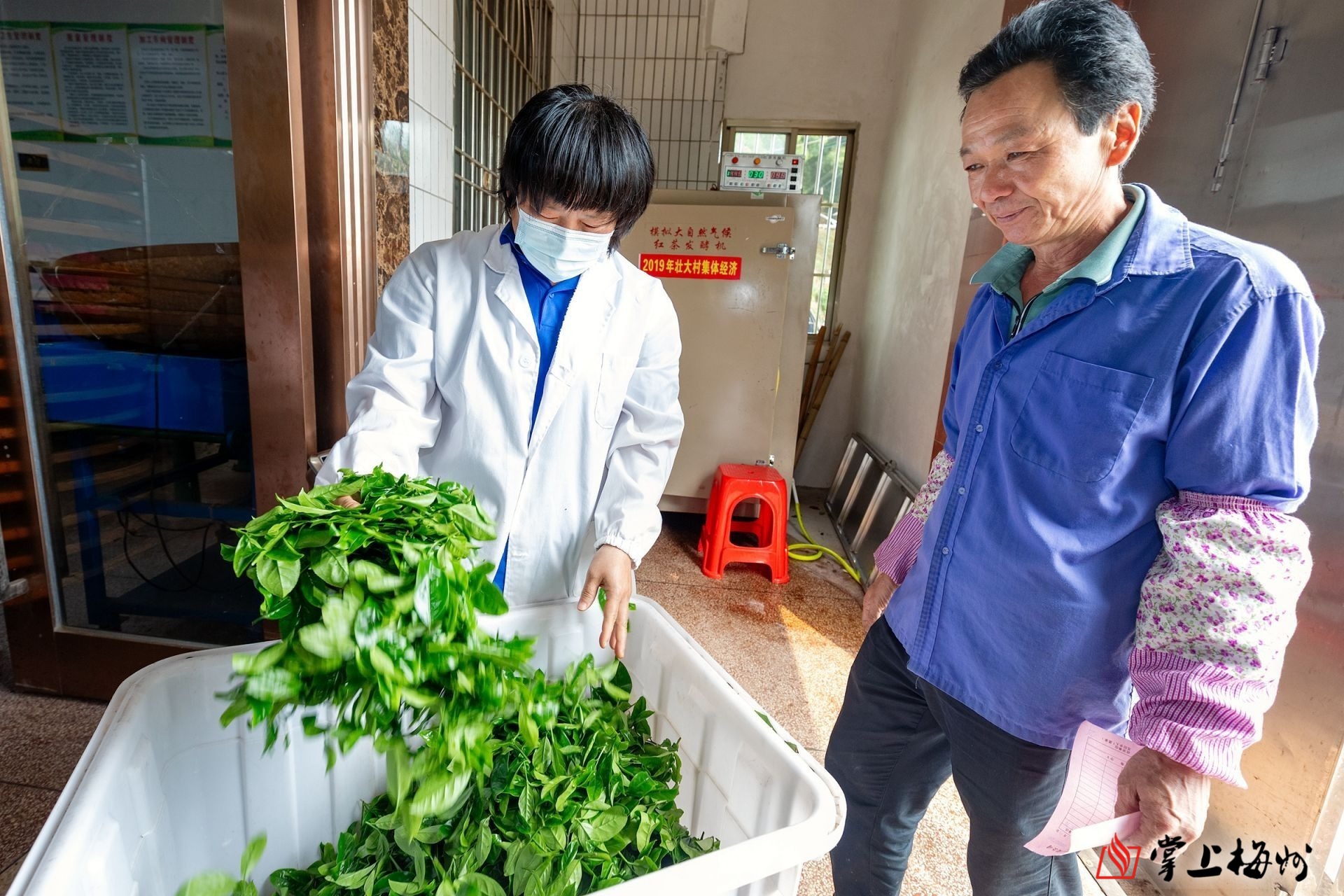 茶农罗勇辉在鹏发茶叶加工厂出售自己种植的鲜叶。