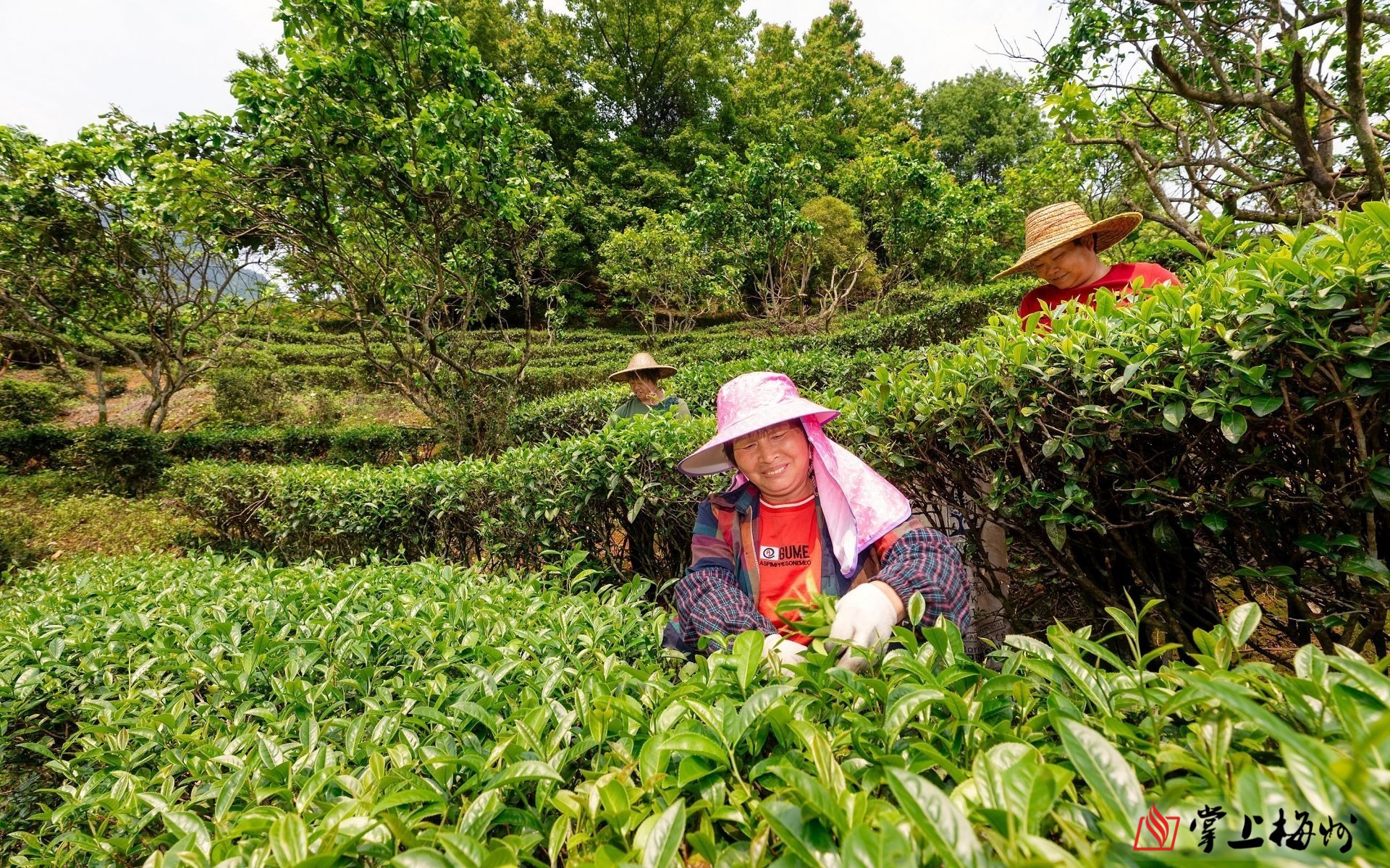 大麻镇桃石村的茶农正在生态茶园采摘高山春茶。