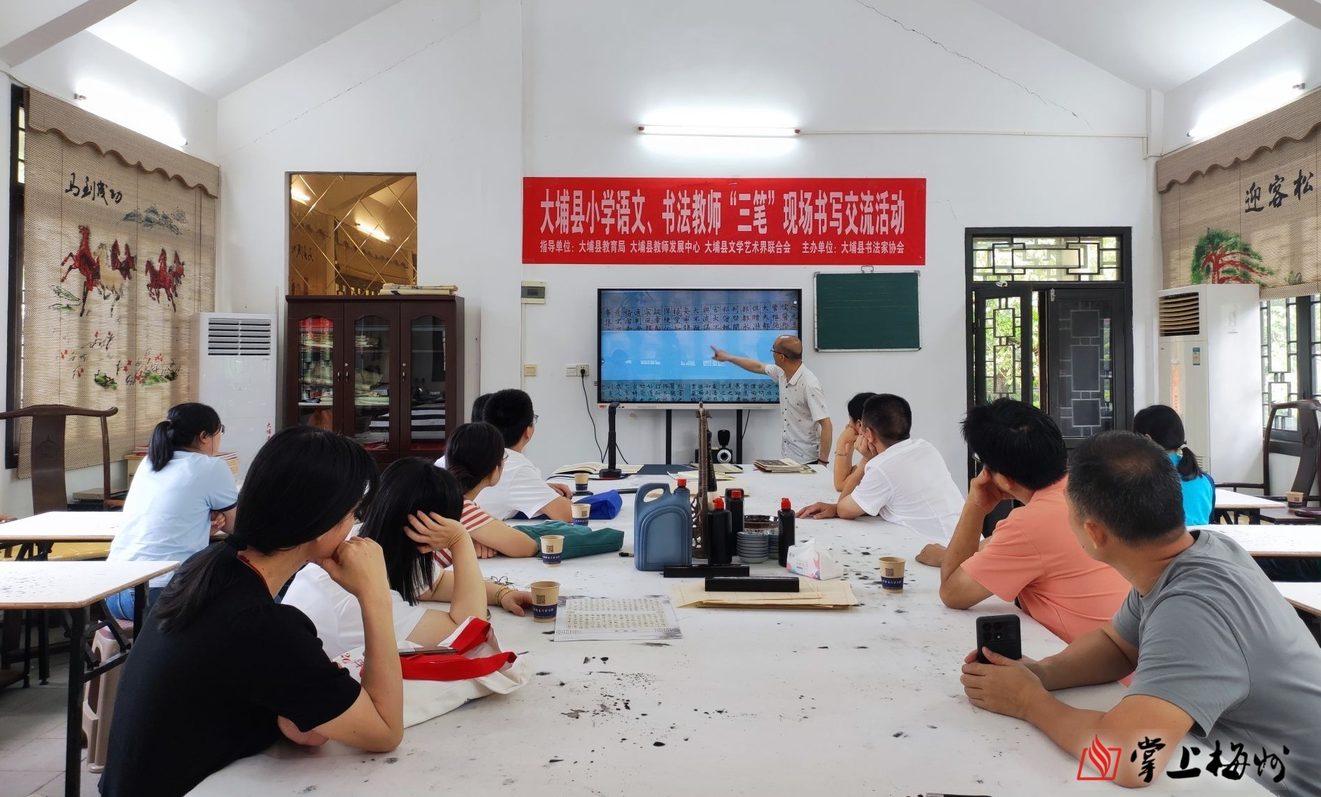 该活动由大埔县教育局、大埔县教师发展中心、大埔县文学艺术界联合会指导,大埔县书法家协会主办,旨在提高大埔县小学语文、书法教师毛笔字、钢笔字、粉笔字“三字”整体素养,促进教师专业化成长。活动现场,大埔县书协的老师们讲解了书写粉笔字楷书书体简体规范字、钢笔字行书和楷书书体简体规范字及毛笔字章法、题款和制作印章的技艺,并与10余名小学语文、书法教师就汉字书写、字体结构、文字布局等方面进行了现场书写交流。教师们泼墨挥毫,或提按顿挫,或精描细画,粉笔字工整清秀,钢笔字苍劲隽美,毛笔字儒雅俊逸,充分展示了大埔县小学语文、书法教师“三字”书写扎实的基本功。