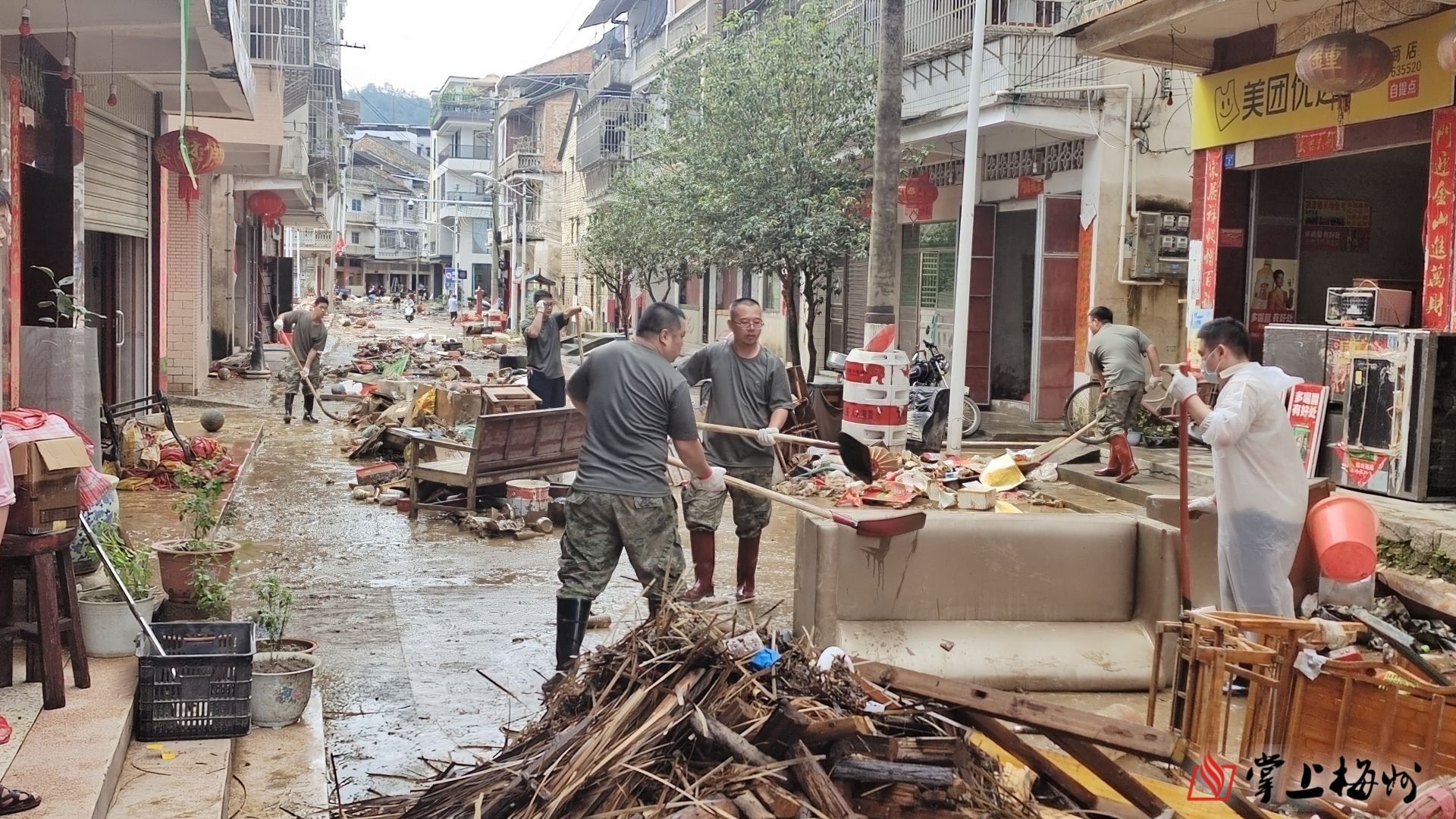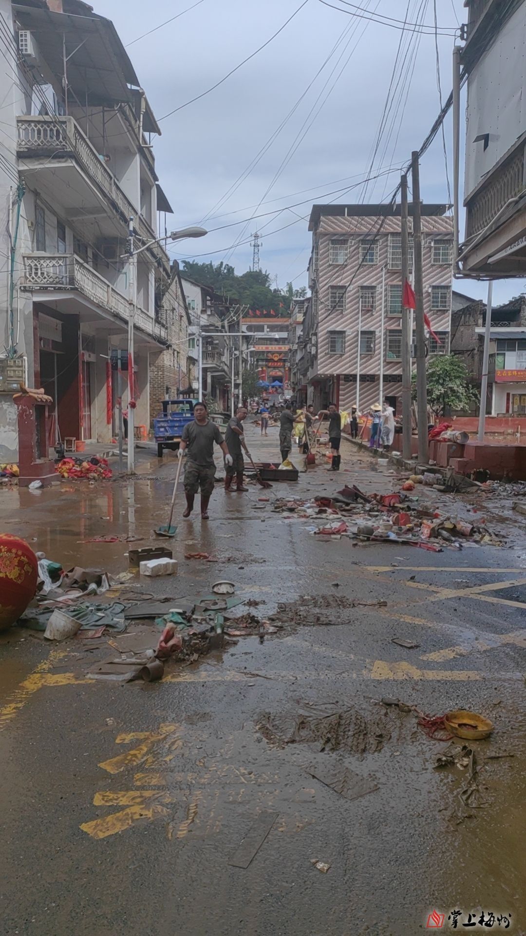 在茶阳镇,民兵正紧张清理街道,将大量淤泥杂物堆积起来集中清理,同拿着扫帚的镇干部合力,将水泥地面上的余淤一扫而净。