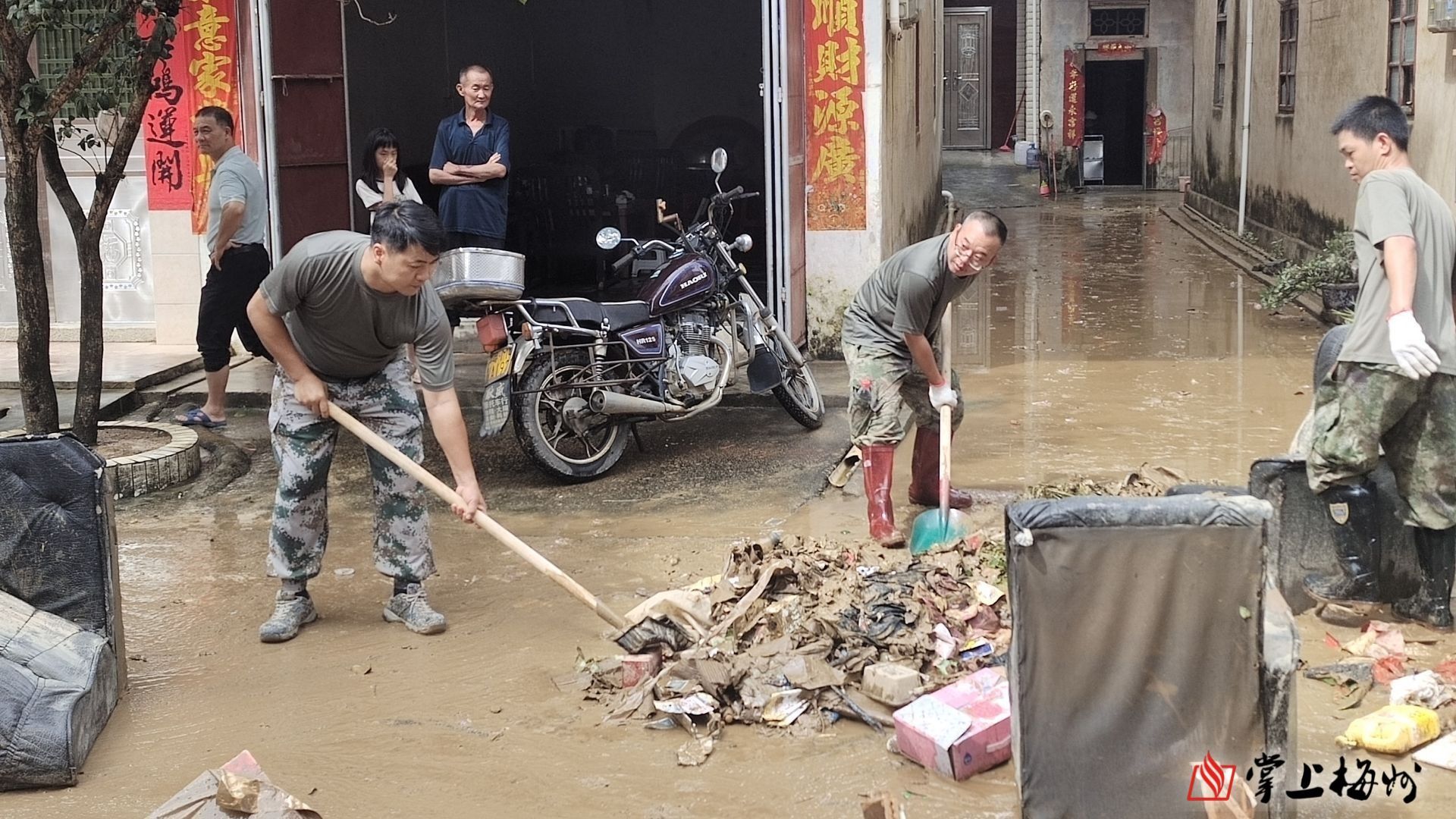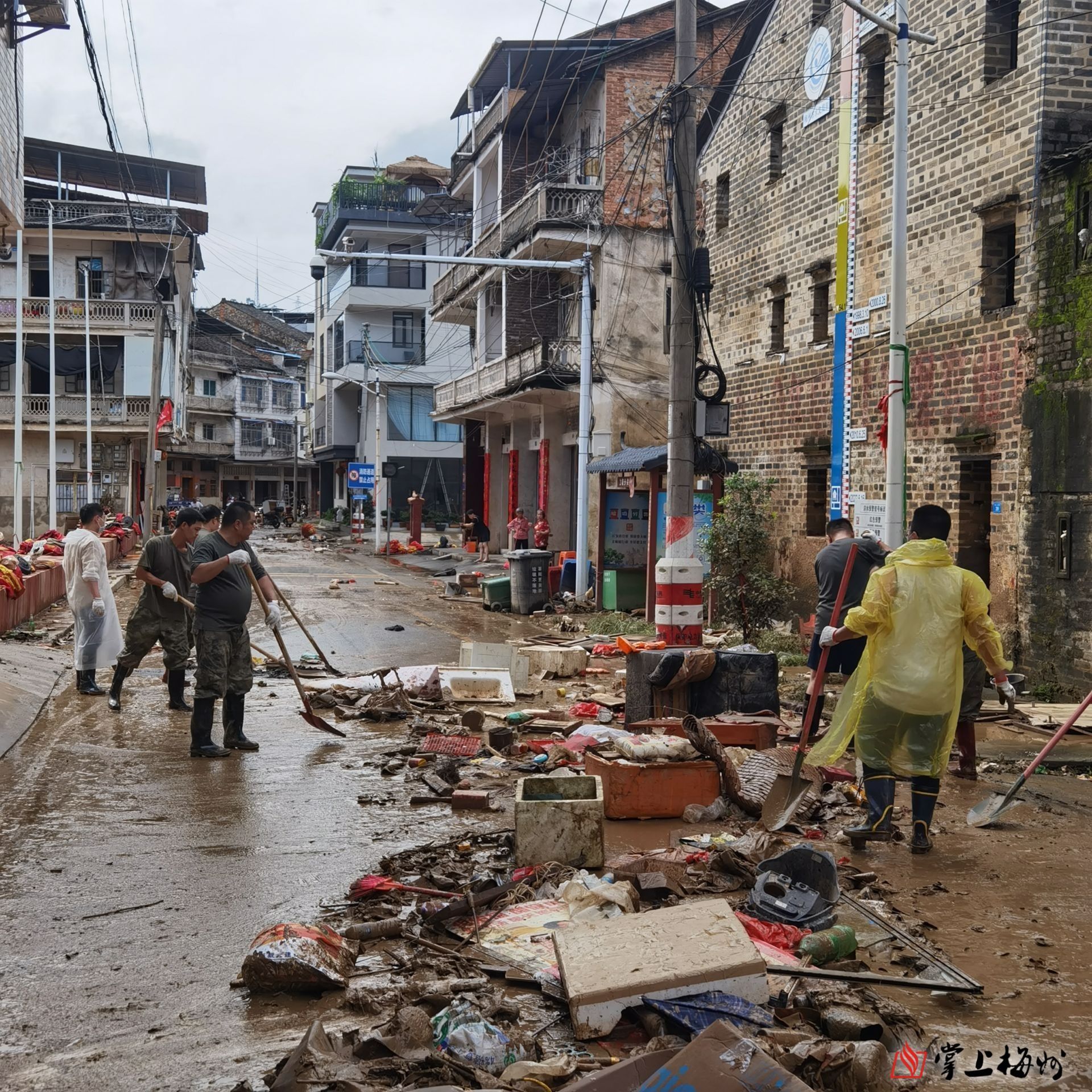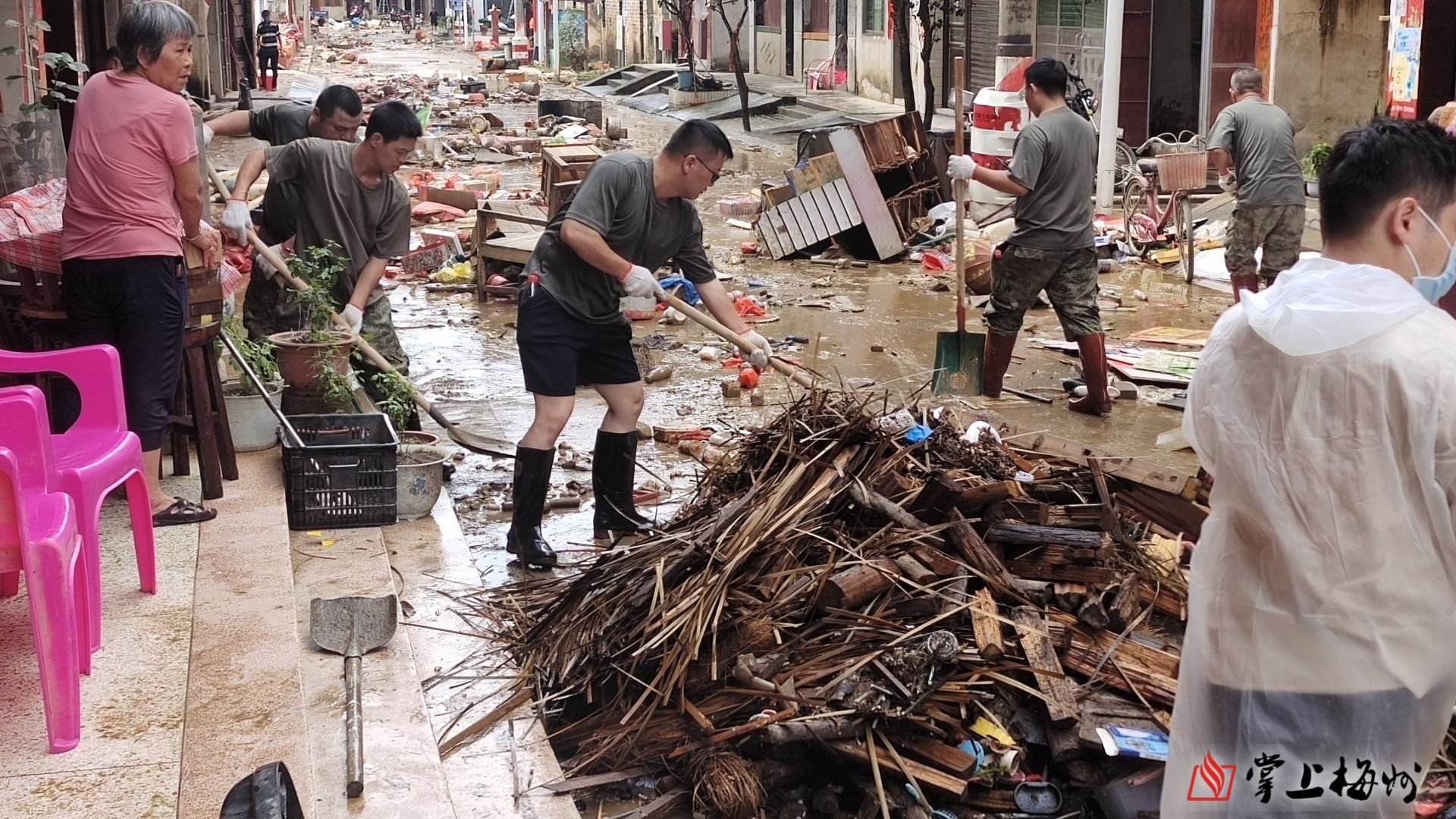 掌上梅州讯 6月18日下午,韩江、梅潭河水位退至警戒水位。洪水退后,街道上到处是淤泥和垃圾,当日下午,大埔县人武部组织民兵在茶阳镇、高陂镇等地的街道紧急集结,他们拿着铁锹、扫把,帮助当地居民清理街道淤泥和垃圾,恢复灾后生产生活。