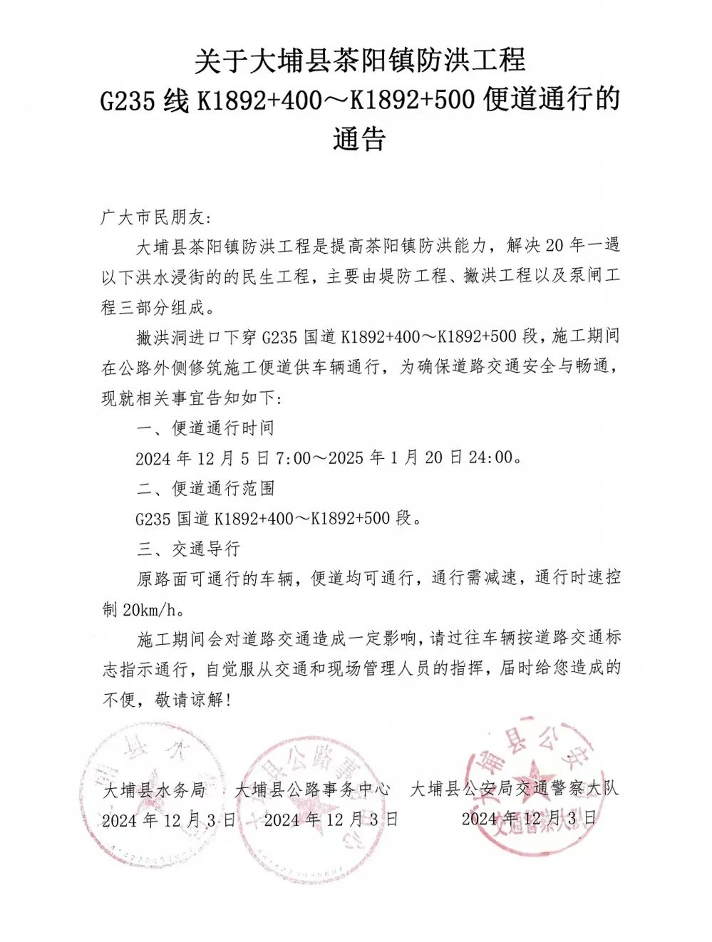 注意绕行!大埔县茶阳镇G235部分路段进行施工