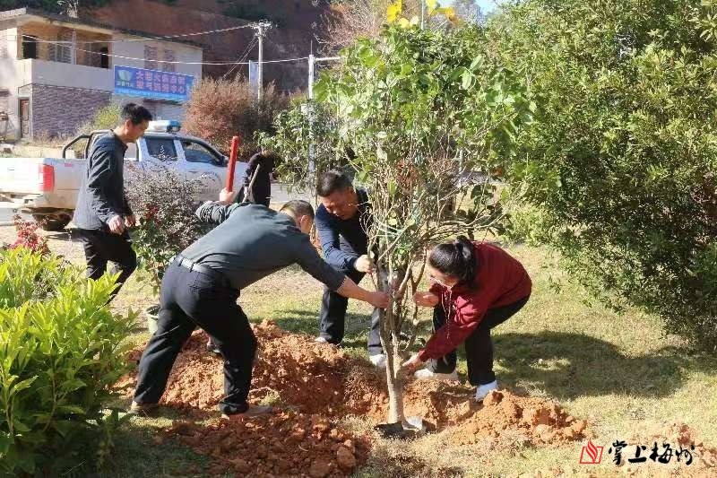 活动中,党员干部们热情高涨,挥锹铲土,固苗培土,浇水灌溉,配合默契,忙碌而有序。经过大家的努力,一棵棵绿意盎然的桂花树迎风而立,一簇簇三角梅悄然绽放,尽显蓬勃生机,为即将到来的新春增添一抹生机与活力。