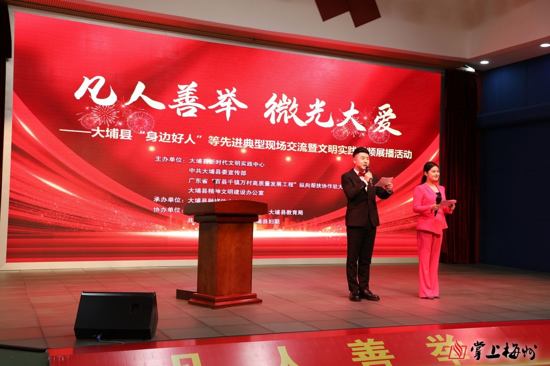 掌上梅州讯 1月15日,大埔举办“凡人善举 微光大爱”——大埔县“身边好人”等先进典型现场交流暨文明实践视频展播活动。梅州市委宣传部副部长、市文明办主任张爱芳,县委副书记、“百千万工程”帮扶协作驻大埔县工作队队长吴静等参加活动。