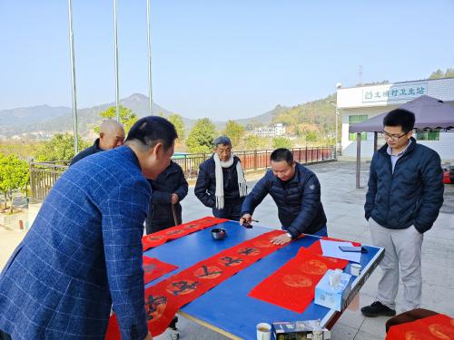 与此同时,现场写春联送春联活动也热闹非凡。在北埔村村委会门口,书法家执笔挥毫泼墨,笔走龙蛇,一幅幅饱含新春祝福和美好愿景的春联在他们的笔下诞生。“迎春迎喜迎富贵,接财接福接平安”“金龙送福千家喜,银蛇迎春万户欢”等充满喜庆的春联,吸引了众多村民纷纷驻足围观。现场大学生志愿者则在一旁帮忙晾晒整理春联、维持活动秩序,并热情地将一幅幅春联递到村民手中,并与村民合影,用相机定格幸福瞬间。