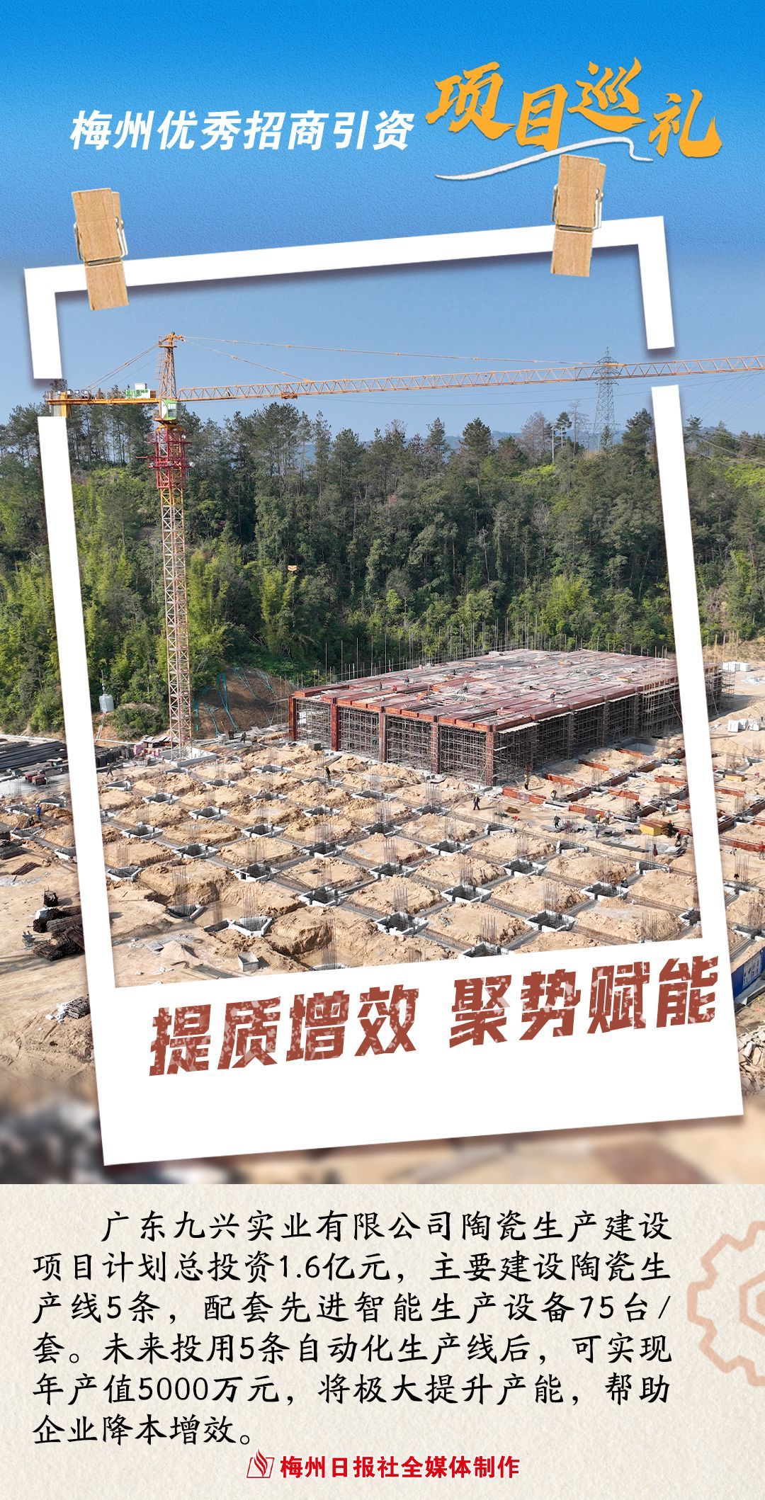 “我们今年的主要建设内容包括厂房主体、办公楼、陶瓷智能生产设备等。按照目前进度,预计今年7月可建成,10月投产。”广东九兴实业有限公司项目部经理郭广平介绍,该项目能取得如此显著的建设成效,正是政企一条心、全力以赴攻坚的体现。