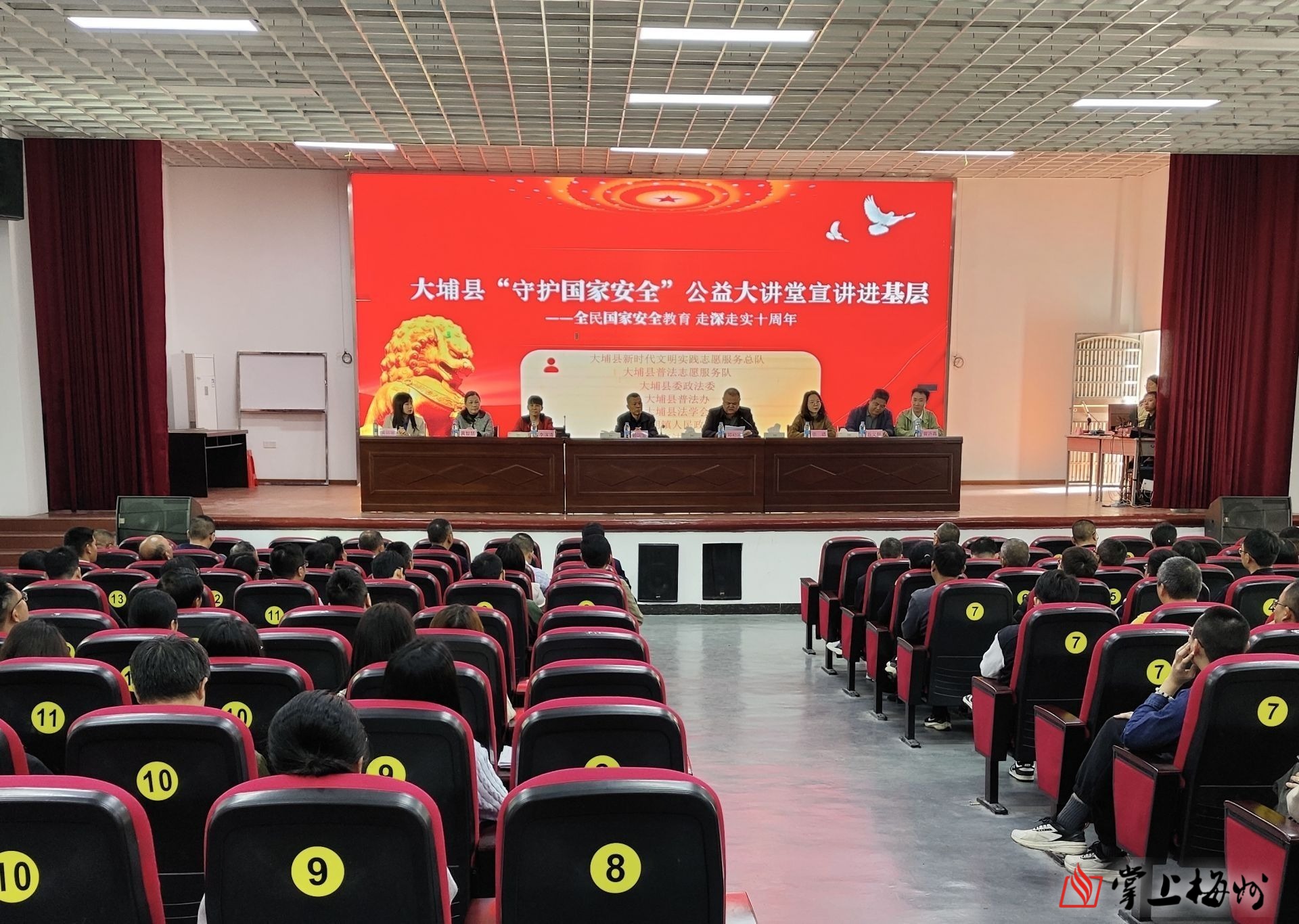 掌上梅州讯 4月14日,在大埔县新时代文明实践志愿服务总队指导下,大埔县普法办联合大埔县委政法委、大埔县法学会到枫朗镇组织开展“守护国家安全”公益大讲堂进基层宣讲活动。本次活动邀请广东法泰律师事务所律师黄丽珊进行授课,大埔县司法局副局长赖国营、大埔县委政法委调研室主任张璐等一行、枫朗镇全体镇村干部和枫朗镇“法律明白人”参加了本次会议。
