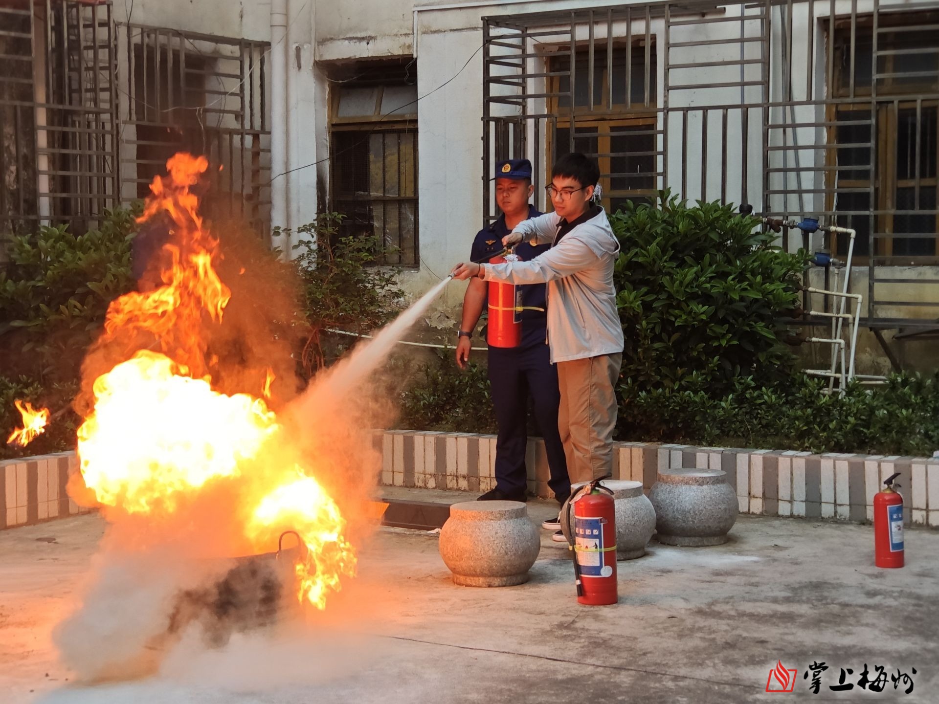 在培训环节,大埔县消防救援大队宣讲员以"理论+案例+实操"的立体化教学模式,为参训人员带来了一场生动的消防安全课。宣讲员首先系统讲解了办公场所隐患排查、家庭防火要点、初期火灾处置等实用知识,重点演示了灭火器"提、拔、握、压"四步操作法和防烟面罩的正确佩戴方法。参训人员积极参与灭火实操演练,现场学习氛围浓厚。