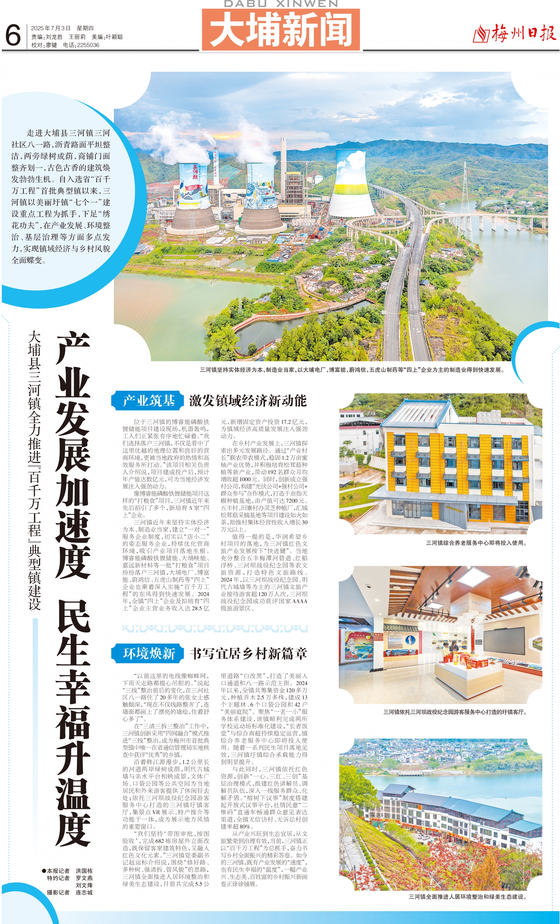 三河镇近年来坚持实体经济为本、制造业当家,建立“一对一”服务企业制度,切实以“店小二”的姿态服务企业,持续优化营商环境,吸引产业项目落地生根。博睿能磷酸铁锂储能、大埔峡能、嘉远新材料等一批“打粮食”项目纷纷落户三河镇,大埔电厂、博富能、蔚鸿信、五虎山制药等“四上”企业也乘着深入实施“百千万工程”的东风得到快速发展。2024年,全镇“四上”企业及拟培育“四上”企业主营业务收入达28.5亿元,新增固定资产投资17.2亿元,为镇域经济高质量发展注入强劲动力。