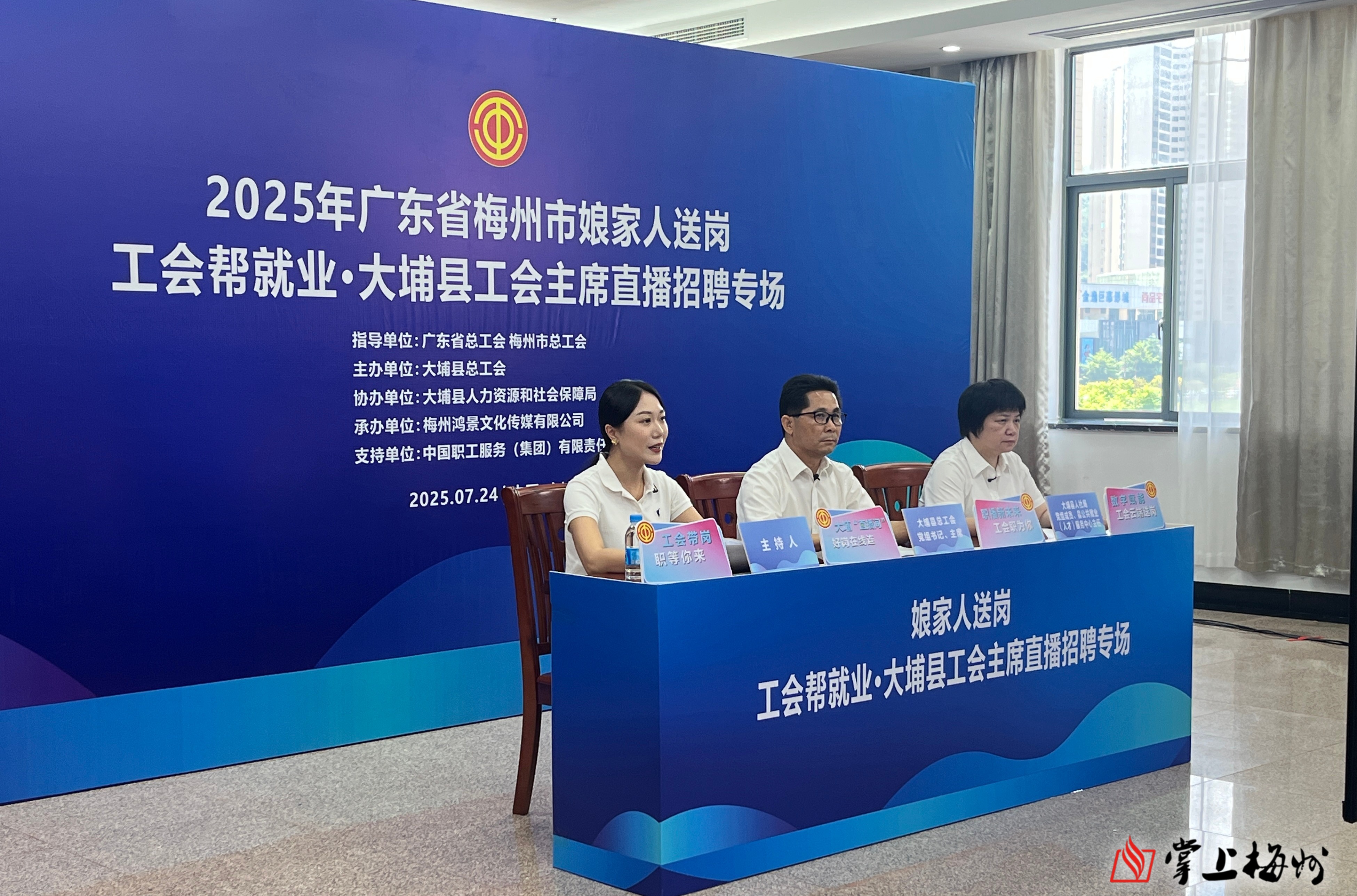 掌上梅州讯 7月24日上午,由大埔县总工会主办,大埔县人力资源和社会保障局协办的“娘家人送岗-工会帮就业”工会主席直播招聘专场活动通过职工之家APP进行线上直播。