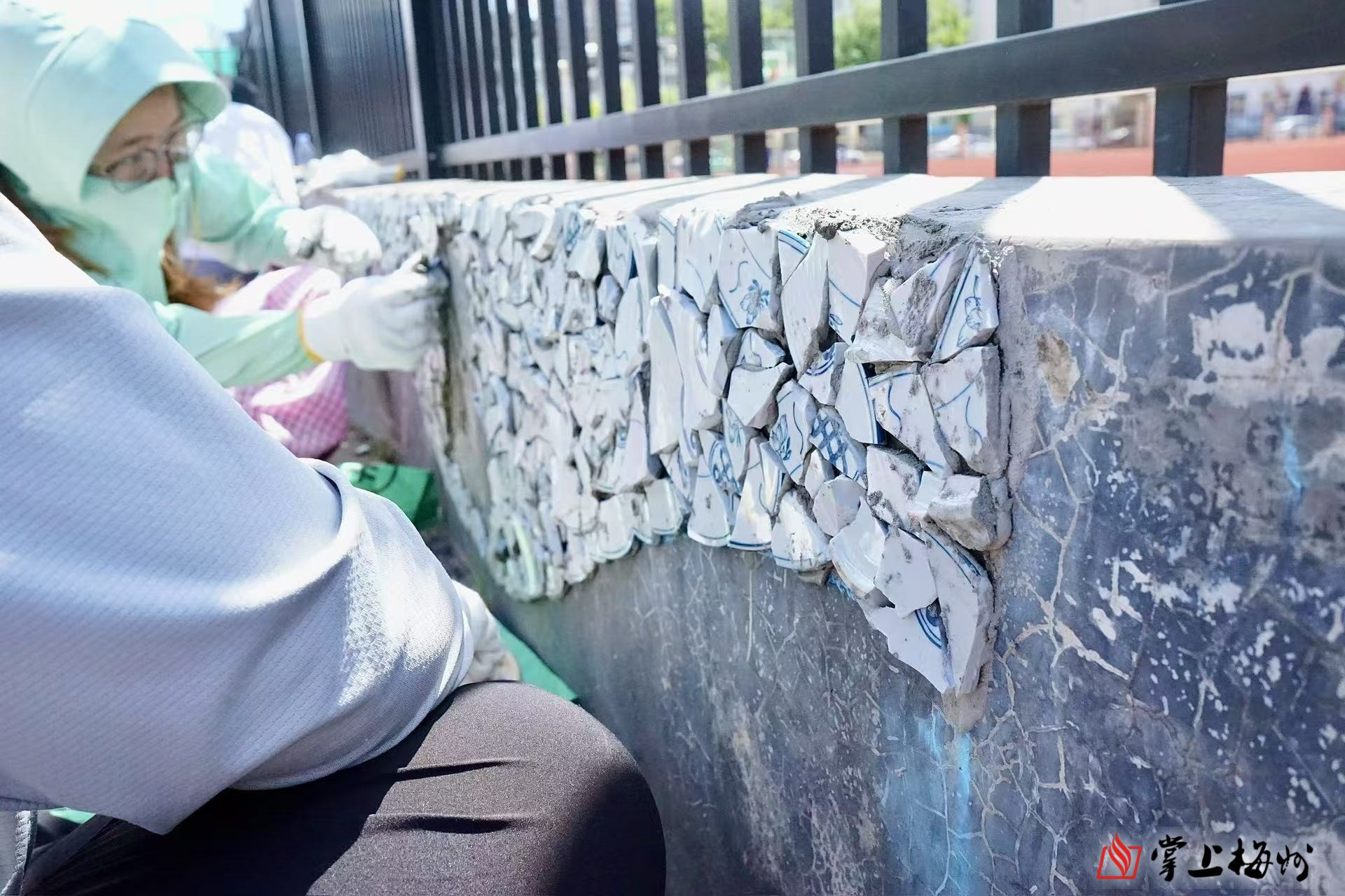 今年以来,高陂镇紧抓“百千万工程”典型镇契机,向各大陶瓷企业发出捐赠陶瓷次品碎片的倡议,用于打造独具特色的“青花地标”“釉彩文化墙”等景观。为响应“百千万工程”号召,突击队在陶瓷厂参观学习的过程中,广泛收集陶瓷残次品,开展瓷器片贴墙的乡村特色建设活动。同时,积极动员当地村民、陶瓷厂工人、商户等共同参与,了解他们对瓷器残次品回收利用的看法和建议。突击队员们精心选取高陂中学门口的墙面作为创作阵地,碎瓷片拼贴出极具梅州特色的图案——腌面、沙田柚、客家围屋等跃然于墙上,摇身一变成为特色打卡点。