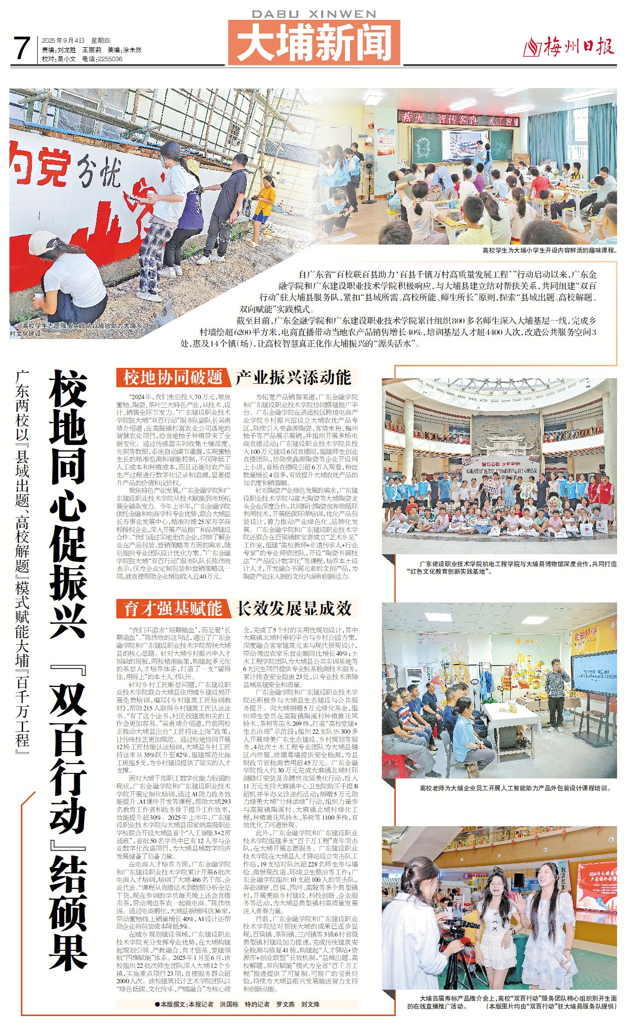 自广东省“百校联百县助力‘百县千镇万村高质量发展工程’”行动启动以来,广东金融学院和广东建设职业技术学院积极响应,与大埔县建立结对帮扶关系,共同组建“双百行动”驻大埔县服务队,紧扣“县域所需、高校所能、师生所长”原则,探索“县域出题、高校解题、双向赋能”实践模式。