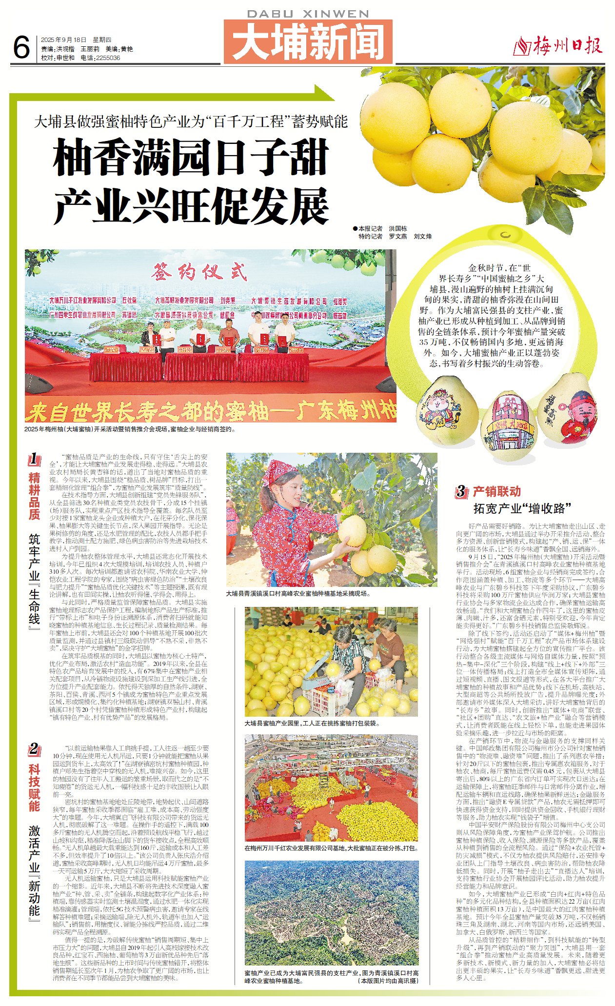 9月15日,“2025年梅州柚(大埔蜜柚)开采活动暨销售推介会”在青溪镇溪口村高峰农业蜜柚种植基地举行。活动现场,6组蜜柚企业与经销商完成签约,合作范围涵盖种植、加工、物流等多个环节——大埔高峰农业与广东碧乡科技签下年度采购协议,广东碧乡科技将采购100万斤蜜柚供应华润万家;大埔县蜜柚行业协会与多家物流企业达成合作,确保蜜柚运输高效畅通。“我们和大埔蜜柚合作四年了,这里的蜜柚皮薄、肉嫩、汁多,还富含硒元素,特别受欢迎,今年肯定能卖得更好。”广东碧乡科技销售总监侯敬辉说。