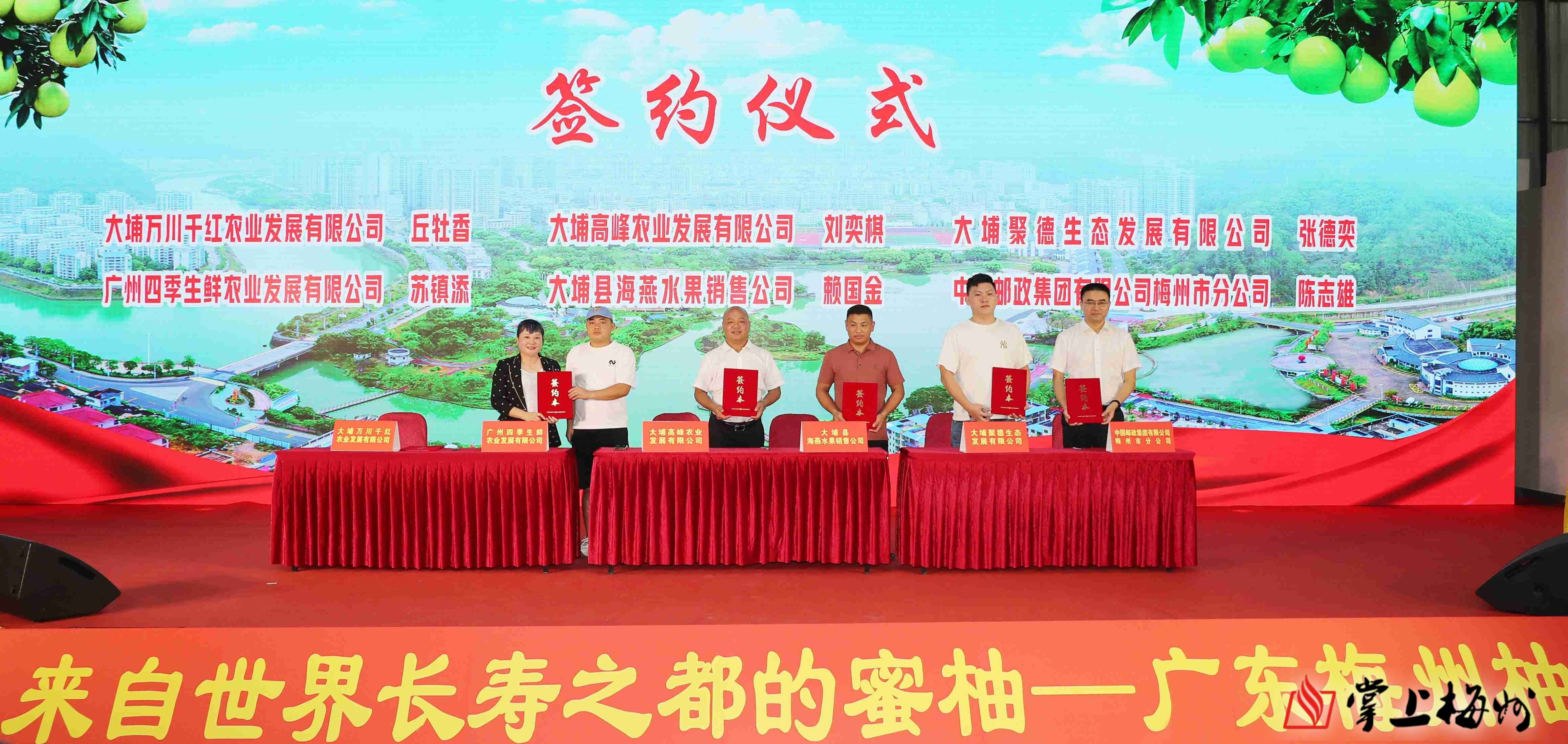 2025年梅州柚(大埔蜜柚)开采活动暨销售推介会现场,蜜柚企业与经销商签约。