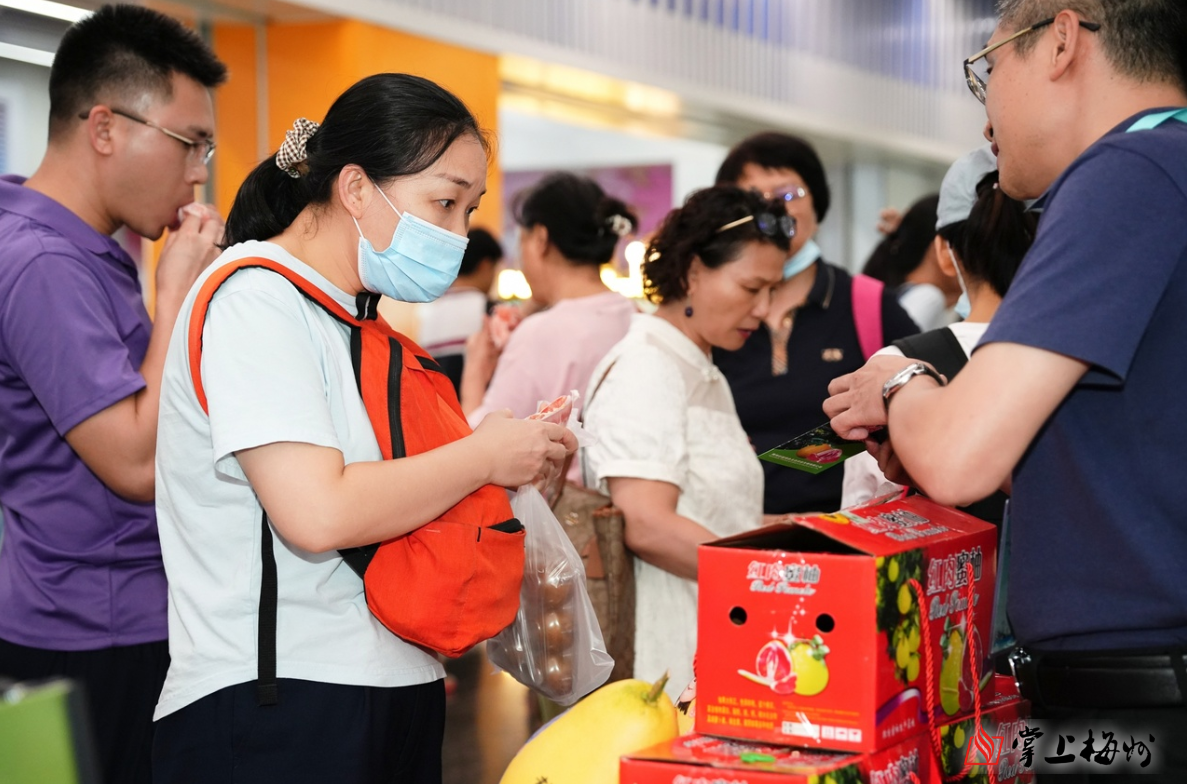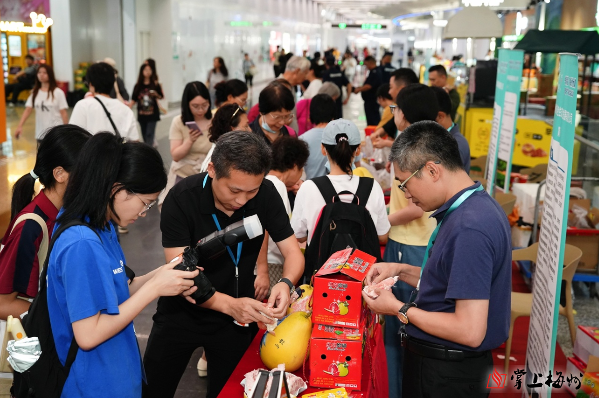 活动现场,大埔县随缘农业科技有限公司、梅州杉富绿色生态农业发展有限公司等6家本土优质企业集中亮相,带来了蜜柚、百香果、豆腐干等特色农产品。饱满圆润的蜜柚、酸甜多汁的百香果、风味独特的豆腐干整齐陈列,清新的果香在地铁站内弥漫,迅速吸引过往市民驻足。不少市民拿起农产仔细查看,在工作人员的热情邀请下品尝口感,亲身感受大埔农产的天然品质与独特魅力,现场咨询采购的市民络绎不绝。