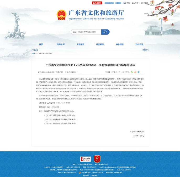 日前,广东省文化和旅游厅依据公示2025年全省乡村酒店(民宿)等级评定结果,审核认定广东温泉宾馆等10家酒店达到金品级乡村酒店标准,广州锦绣香江温泉城酒店等18家酒店达到银品级乡村酒店标准,广州清风半两·丝苗里民宿等30家民宿达到金宿级乡村民宿标准,深圳桃花源艺术村民宿等113家民宿达到银宿级乡村民宿标准。其中,大埔翰林别院民宿、大埔县聚奎楼民宿达到银宿级乡村民宿标准。
