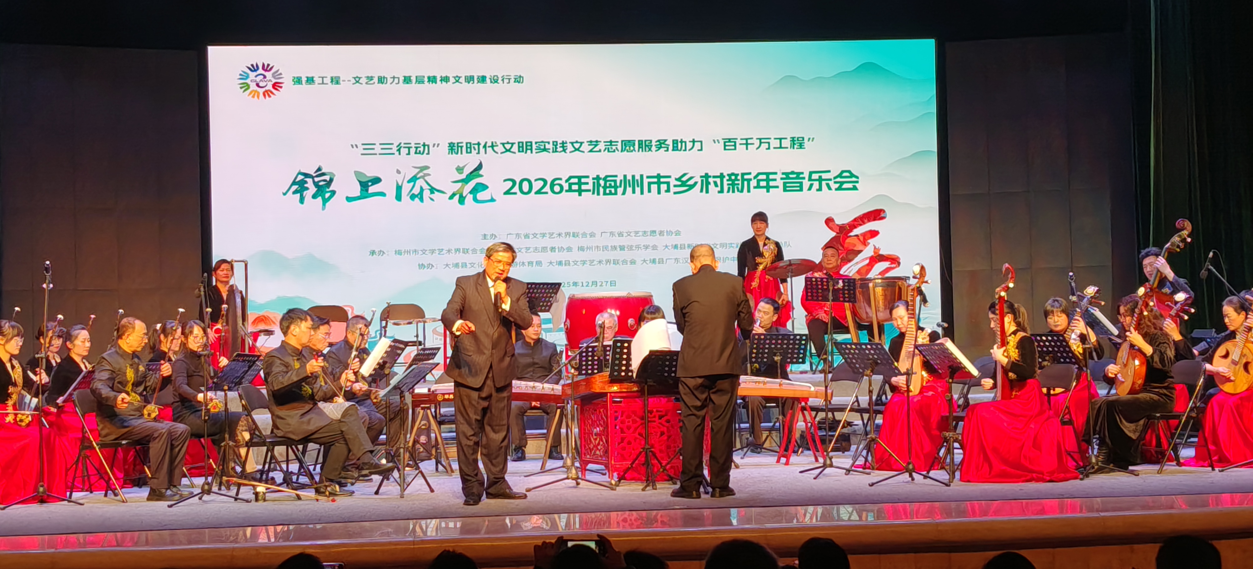 12月27日,“三三行动”新时代文明实践文艺志愿服务助力“百千万工程”锦上添花2026年梅州市乡村新年音乐会在大埔县翰林剧场成功举办。一级演奏员、广东省民族管弦乐学会会长陈佐辉,梅州市文联党组成员、副主席吴朝晖,梅州市文联党组成员、四级调研员谢映,一级演奏员、梅州市民族管弦乐学会会长钟礼俊等出席了活动。
