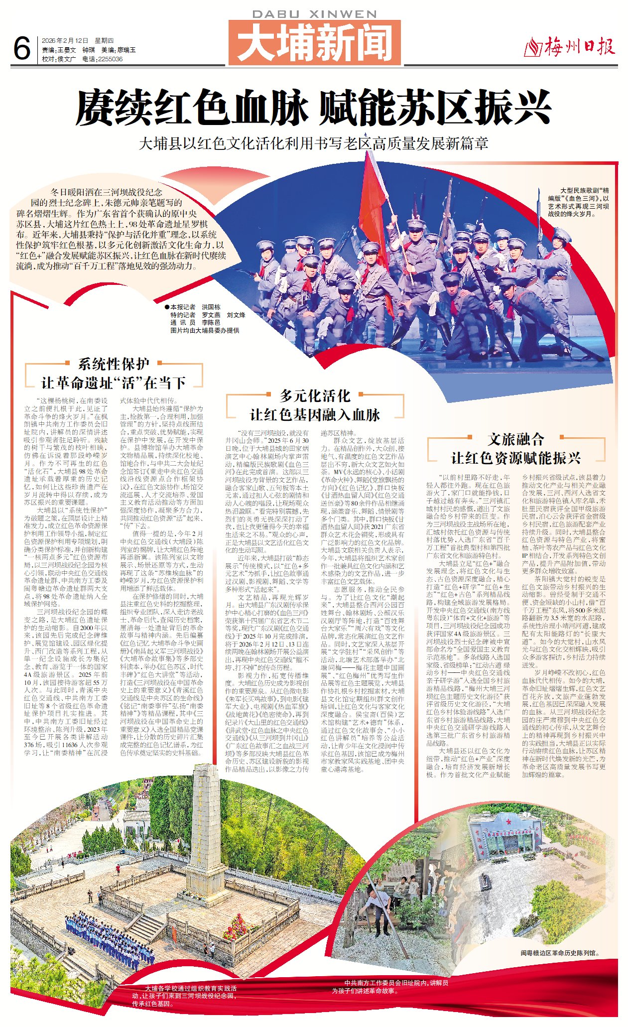 岁月峥嵘不改初心,红色血脉代代相传。如今的大埔,革命旧址熠熠生辉,红色文艺百花齐放,文旅产业蓬勃发展,红色基因已深深融入发展的血脉。从三河坝战役纪念园的庄严肃穆到中央红色交通线的初心传承,从文艺舞台上的精神再现到乡村振兴中的实践担当,大埔县正以实际行动赓续红色血脉,让苏区精神在新时代焕发新的光芒,为革命老区高质量发展书写更加辉煌的篇章。