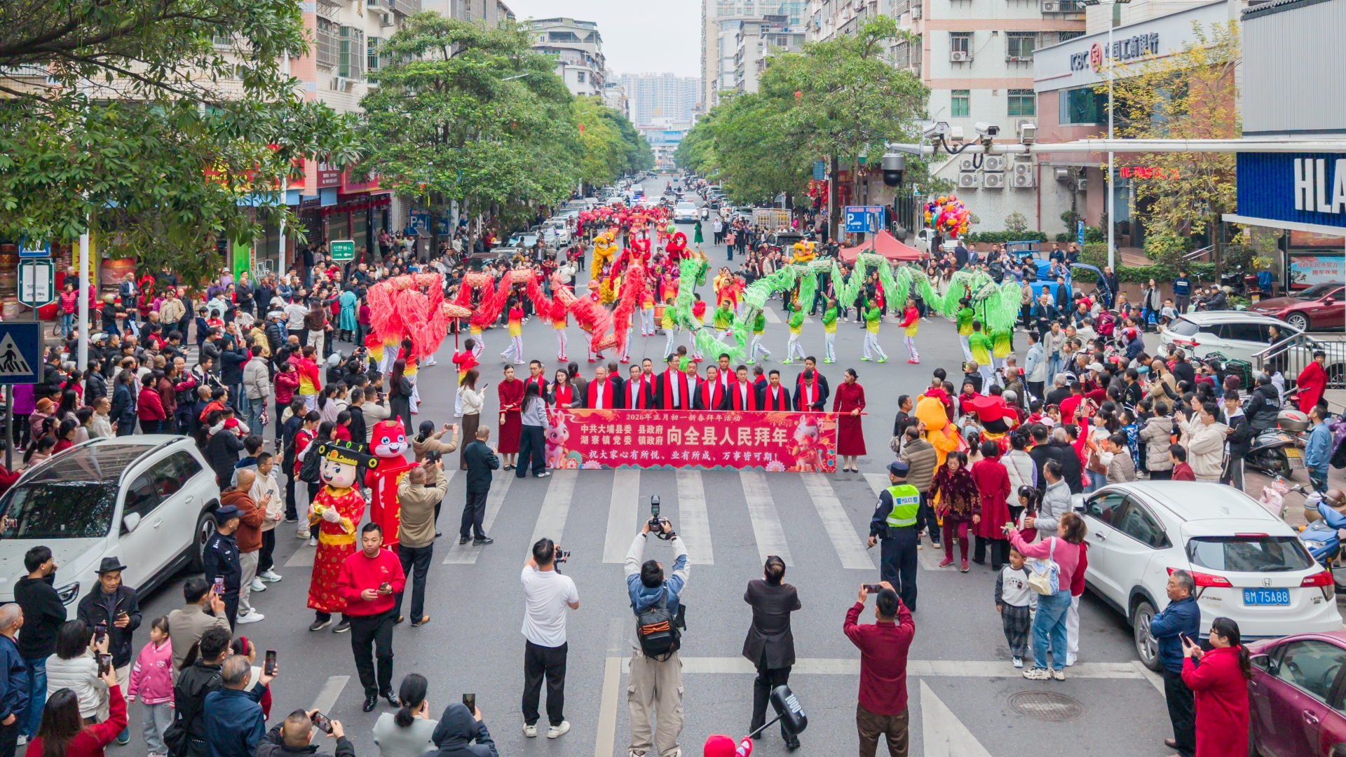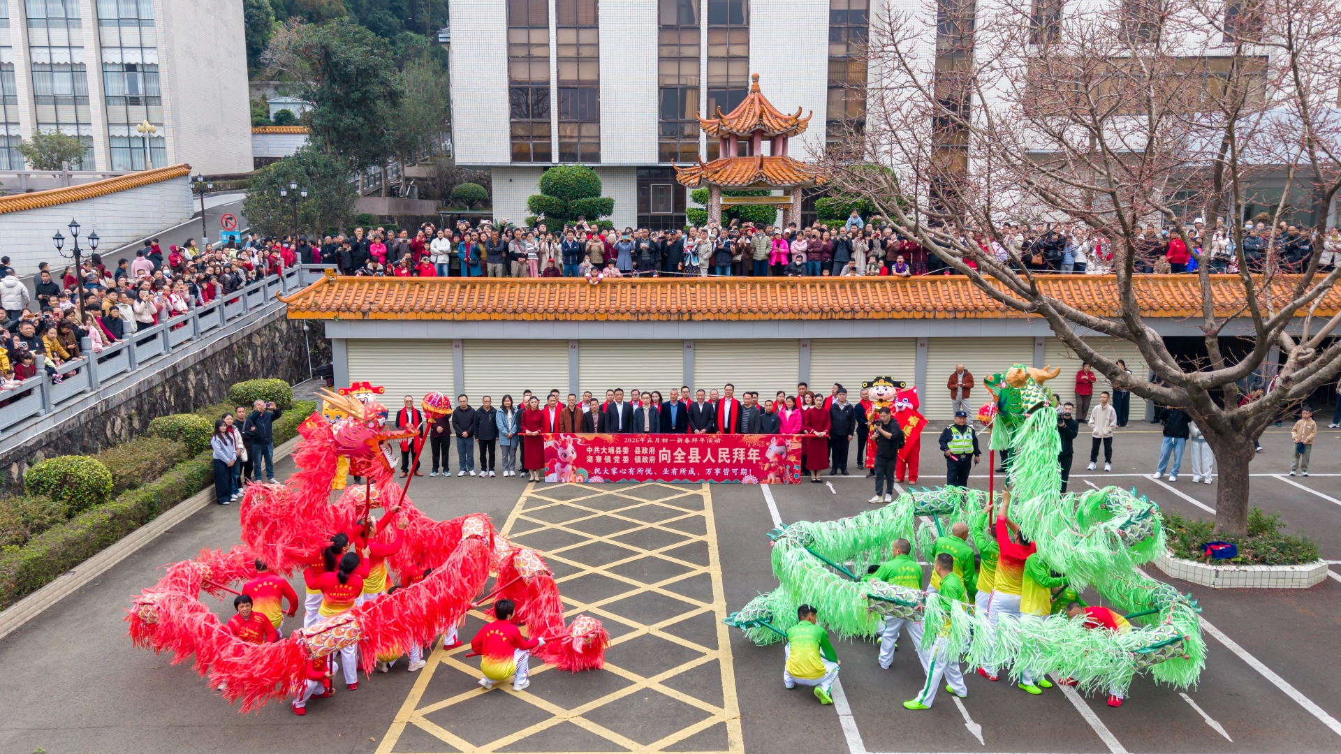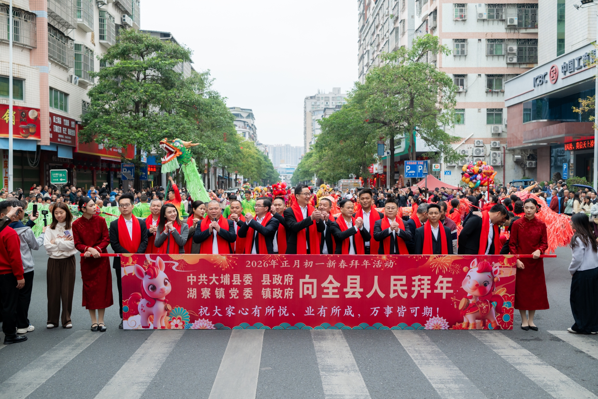 2月17日,农历正月初一,大埔县城处处张灯结彩,洋溢着喜庆祥和的节日气息。上午9时,一场热闹的新春拜年活动在湖寮镇人民政府院内拉开帷幕。由花环龙、舞狮、锣鼓、鲤鱼灯、龙珠灯等多个非遗表演队组成的巡游队伍整装待发,在欢腾的锣鼓声中浩浩荡荡地向大埔县人民政府前进,用一场年味浓郁、非遗荟萃的新春巡游,向全县人民送上丙午马年的美好祝福。